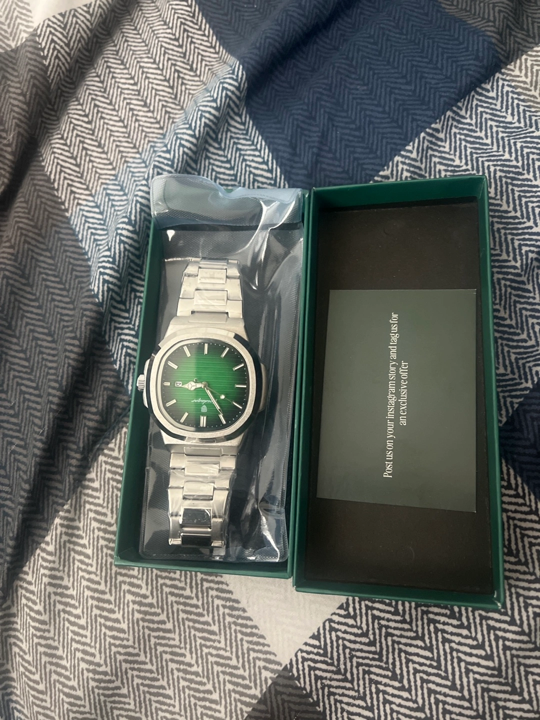Brand new men's wristwatch. Silver stainless steel band. Green face. Comes in original box.