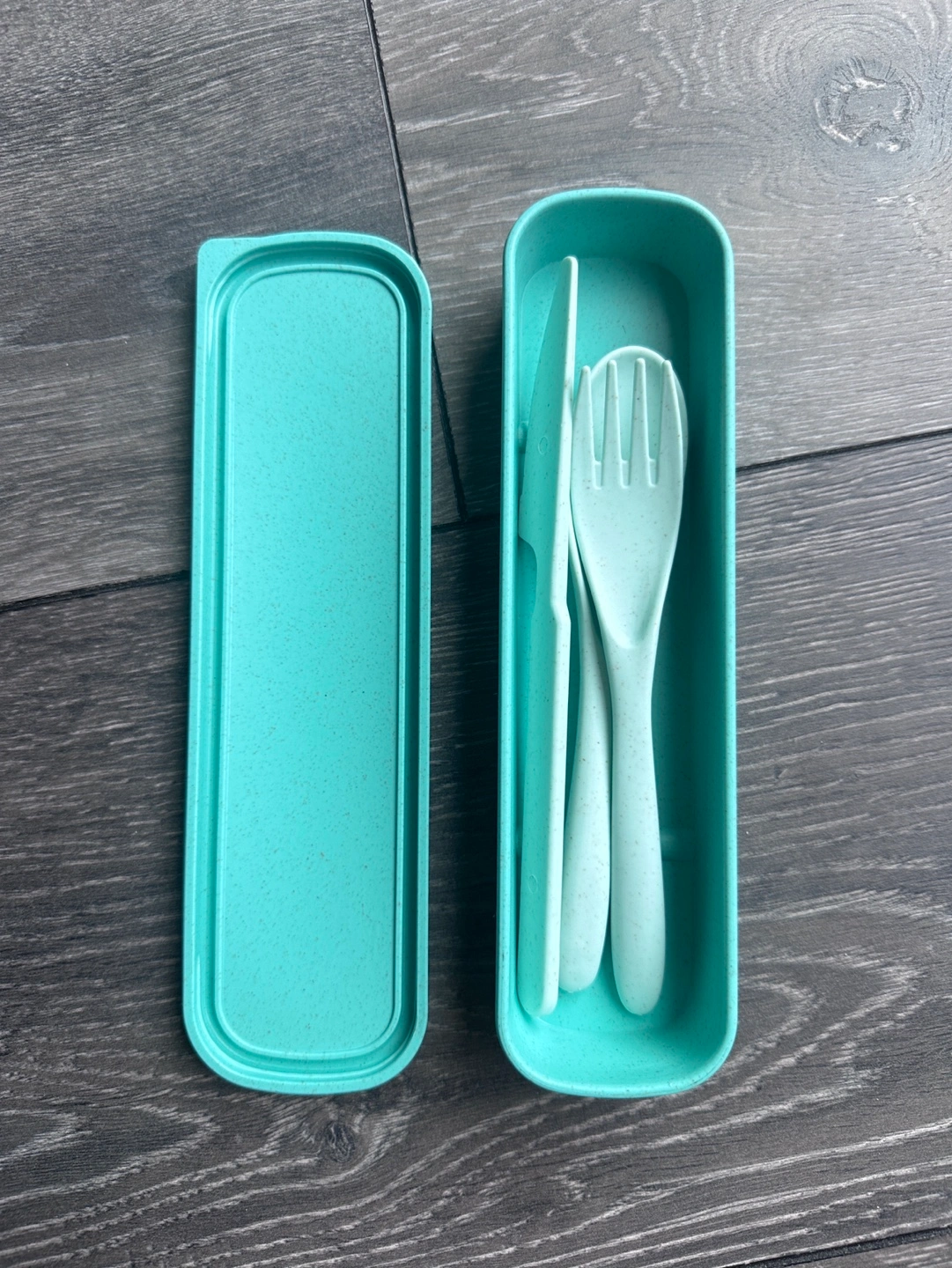 Reusable cutlery set. Includes spoon, fork, and knife. Light teal colour. Comes in a matching carrying case. Perfect for lunch on the go. Pickup at 403 Church St, cash ONLY.