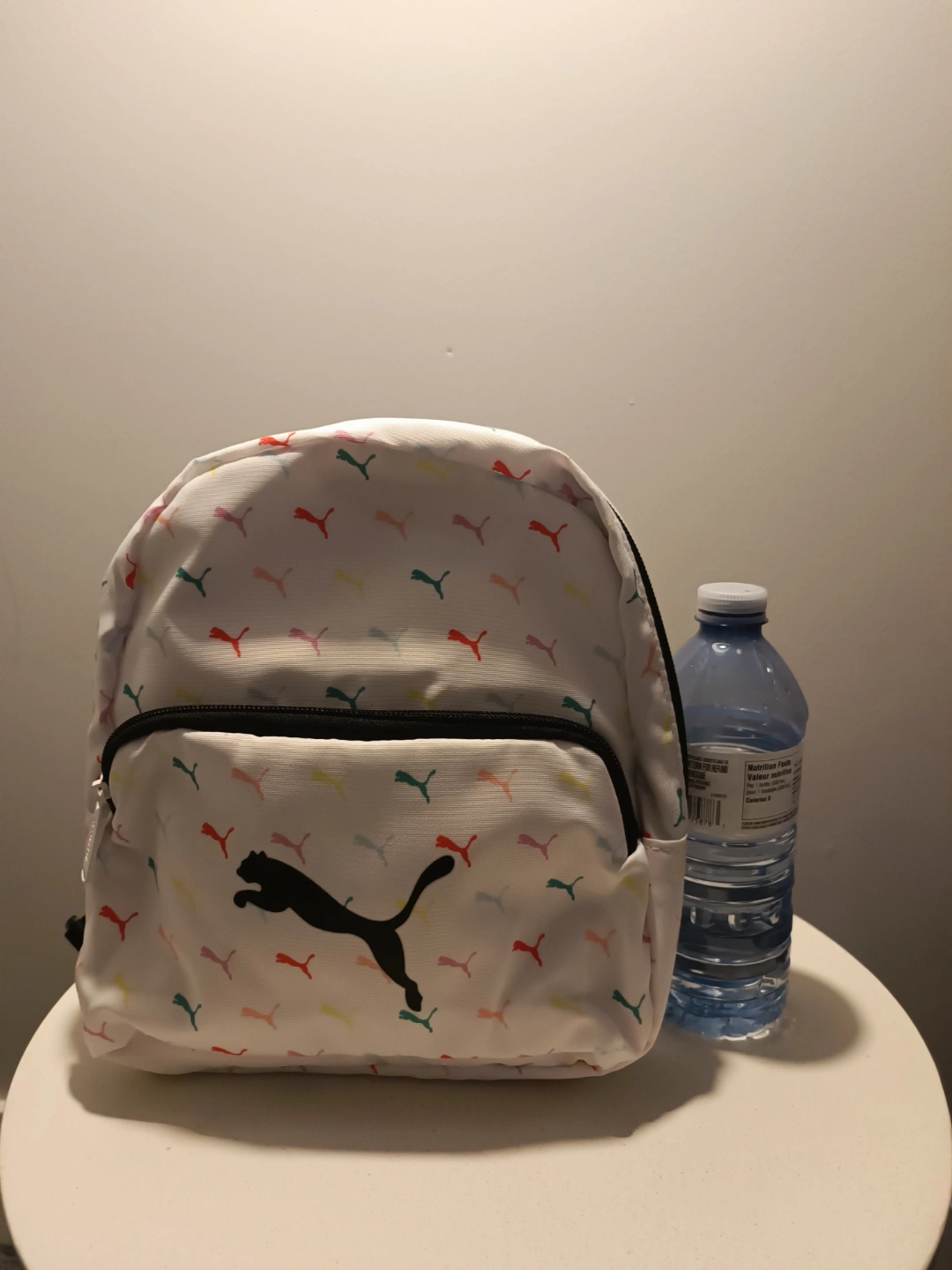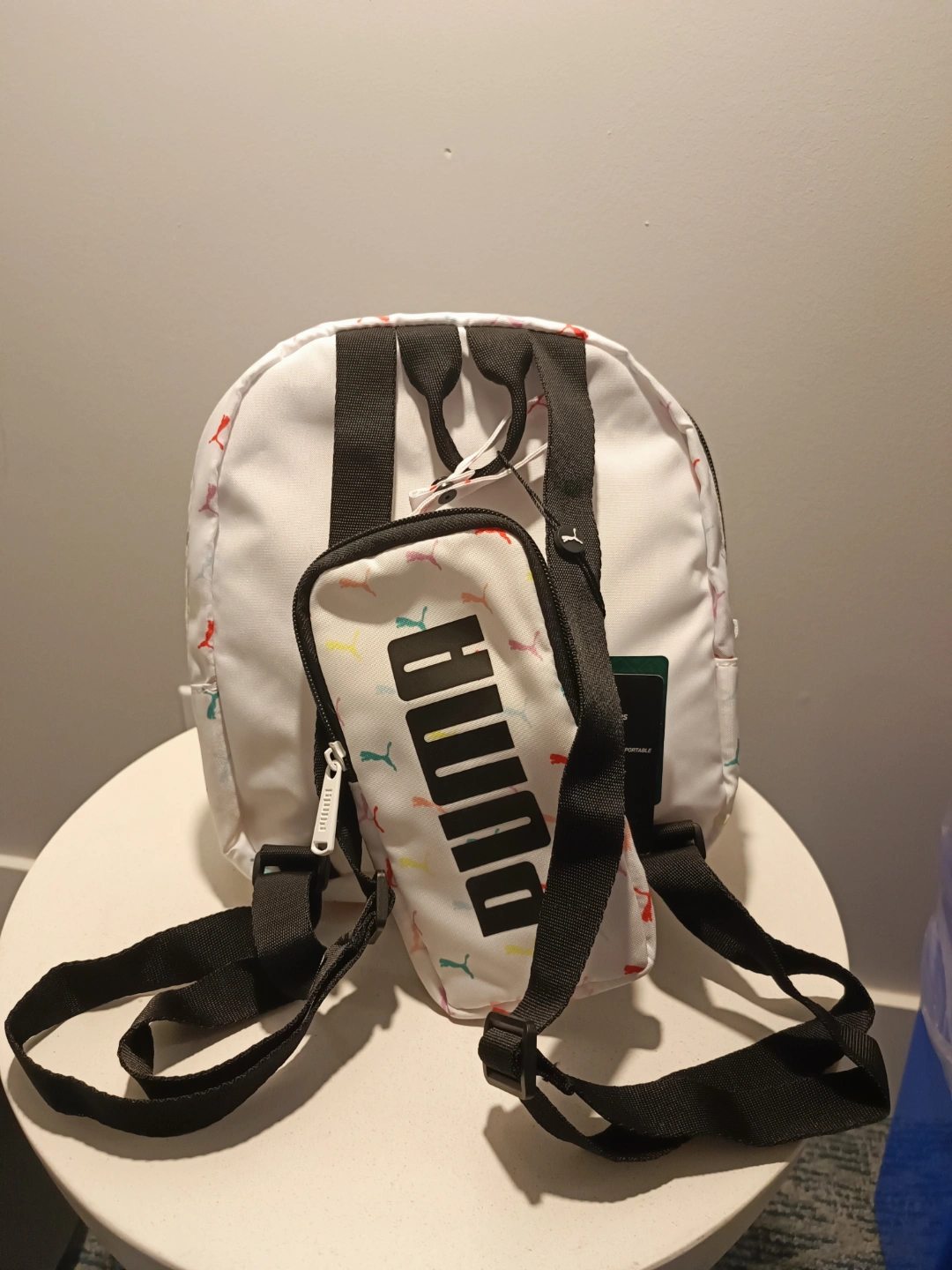 New never used Cute mini backpack. Features adjustable straps, haul handle, cell phone pouch, and exterior zip pocket. Rainbow Puma logo pattern. Bottle of water for scaling. Pick Up: Commercial Broadway Station