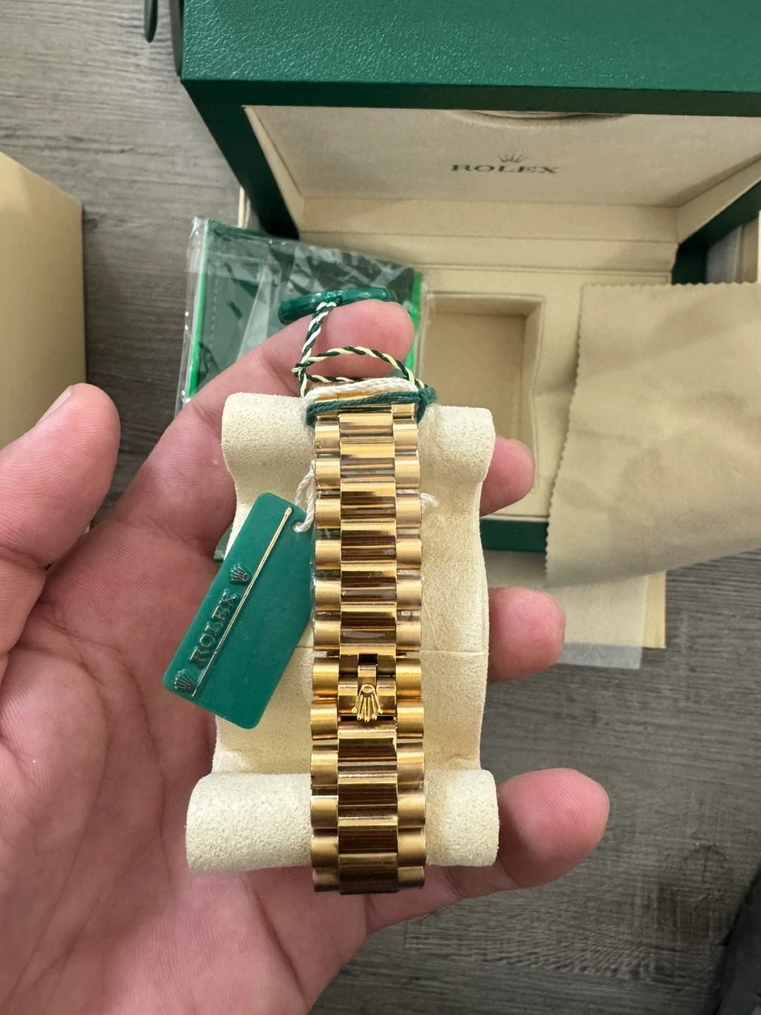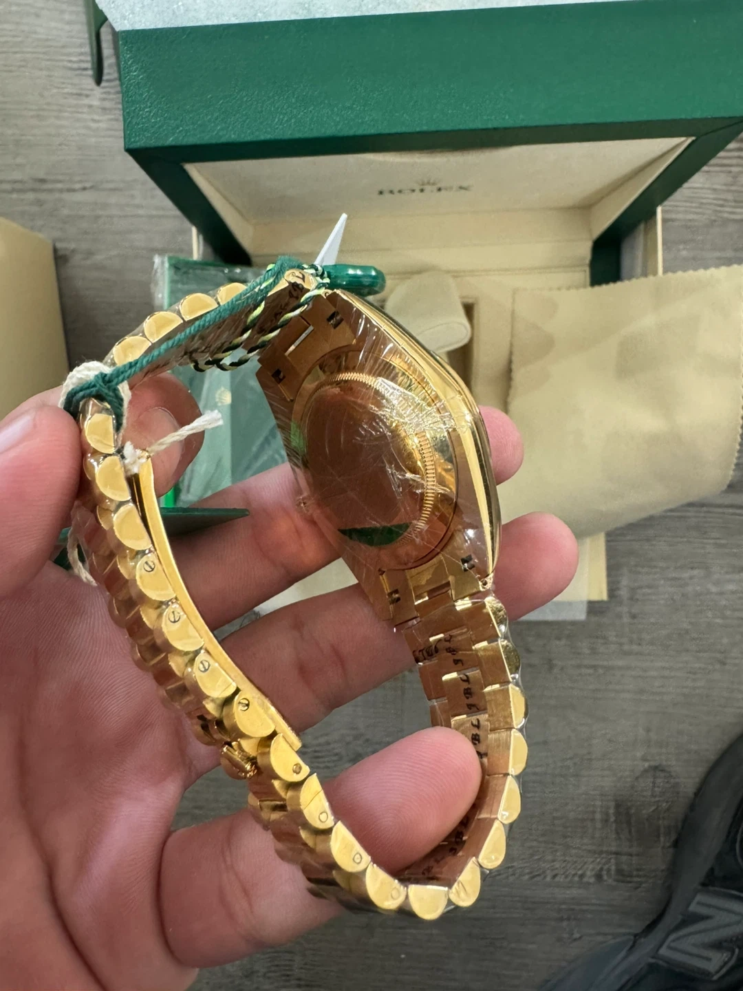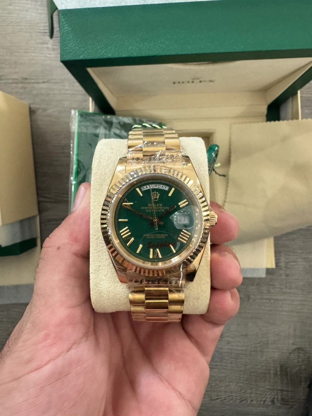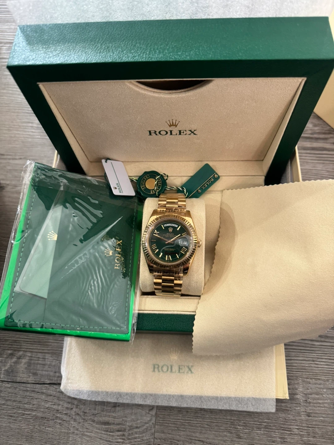 Selling a brand new Rolex Day-Date. It's gold with a green face and comes with the box and papers