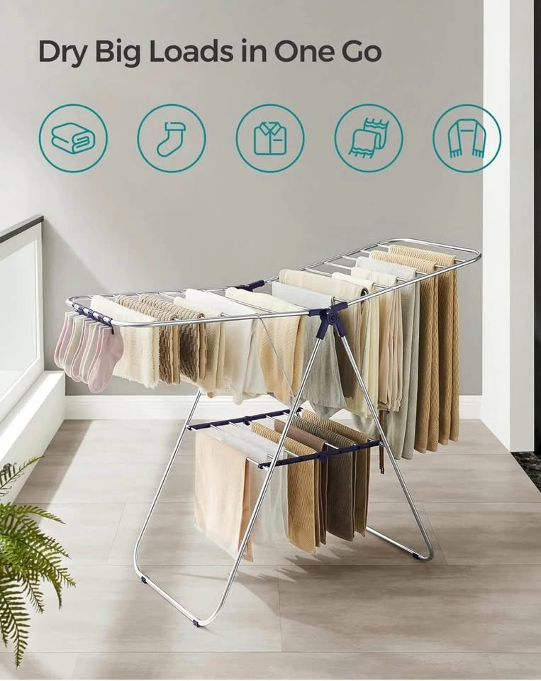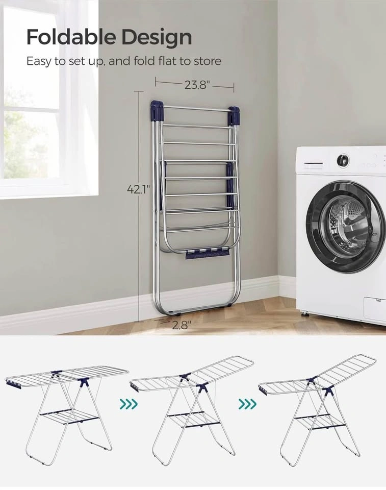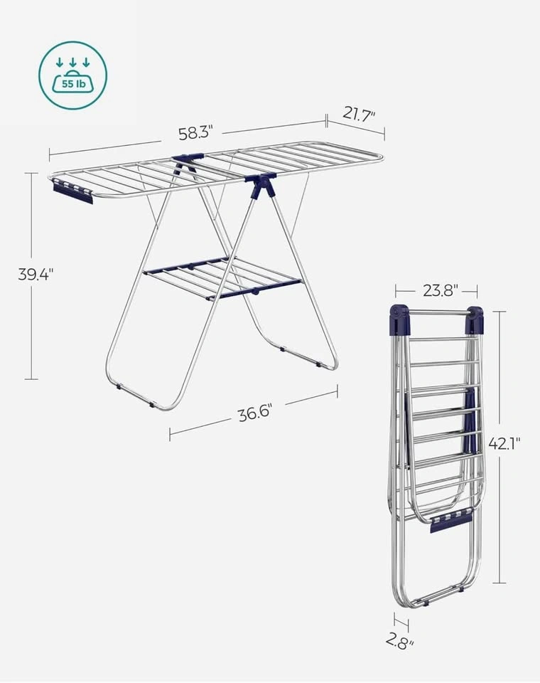 All-in-One Drying Solution: The 24 hanging rods offer ample space for clothes, towels, and blankets. The 27 clips keep lightweight items secure. Adjustable Wings: The top 2 wings, each with 3 adjustable heights from the floor (39.4", 44.1", and 49.2"), allow you to dry clothes of varying lengths. Fold and Move Around Easily: When not in use, simply fold the drying rack down flat, to 2.8"D x 23.8"W x 42.1"H in size, for easy storage. Its lightweight design makes it a breeze to transport. Easy-Peasy Assembly: No screws are required. With numbered parts and step-by-step instructions, you'll be able to put together your laundry rack quickly and easily. Rust-Resistant & Heavy-Duty: Boasting thick steel tubes with a specially treated finish and durable plastic connectors, this clothes drying rack is capable of holding up to 55 lb. Pick up - Courtice. Please check my other listings!