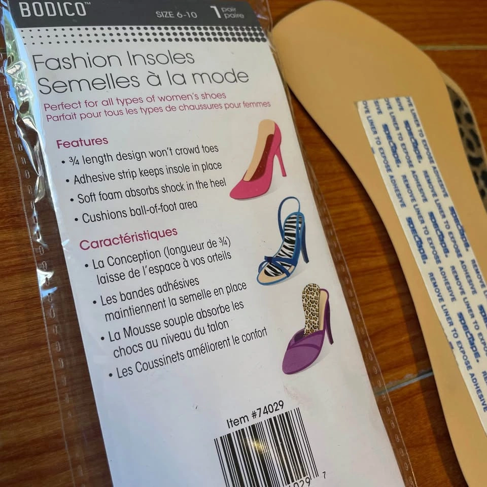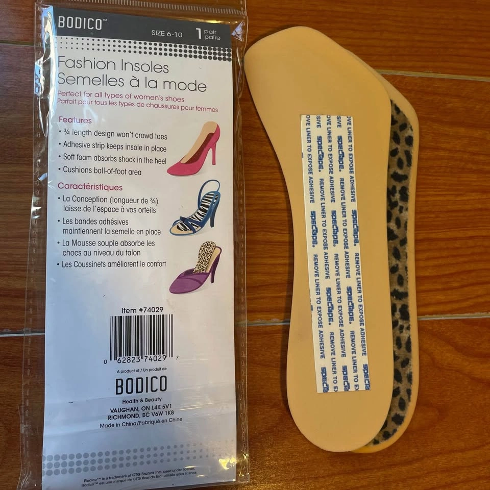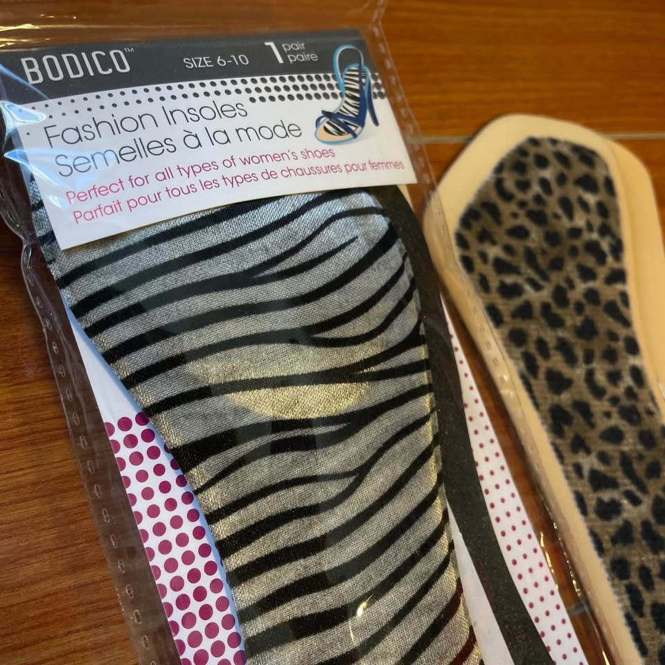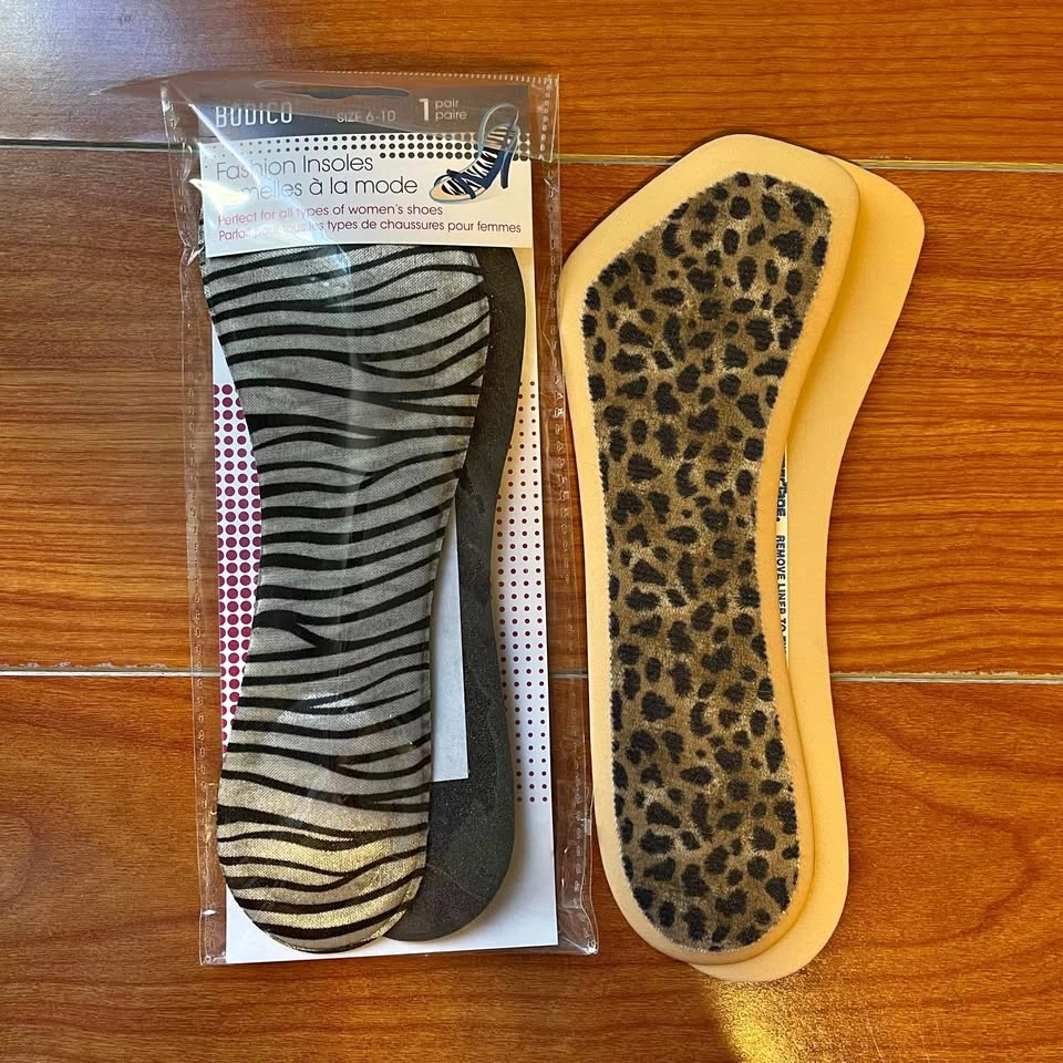 Pick up at Don Mils & Steeles Zebra print - new in package Leopard print - new without package The zebra print insoles are more cushioned, and the leopard print ones are flatter. Please see photos for details. Stylish patterned insoles, perfect for high heels, pumps, or sandals. Comes with adhesive backing to prevent shifting. They are suitable for everyday use, providing cushioning and support to the feet while fitting seamlessly into various shoe styles.
