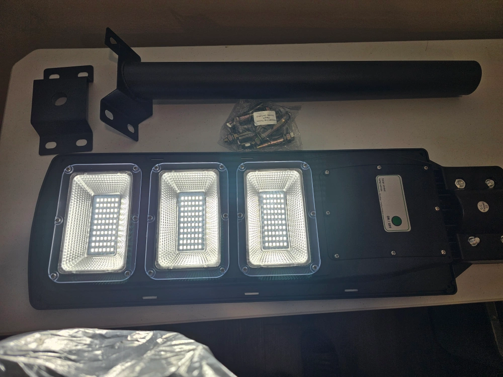 Outdoor solar light. Three LED panels. Includes mounting pole and hardware. Never used.