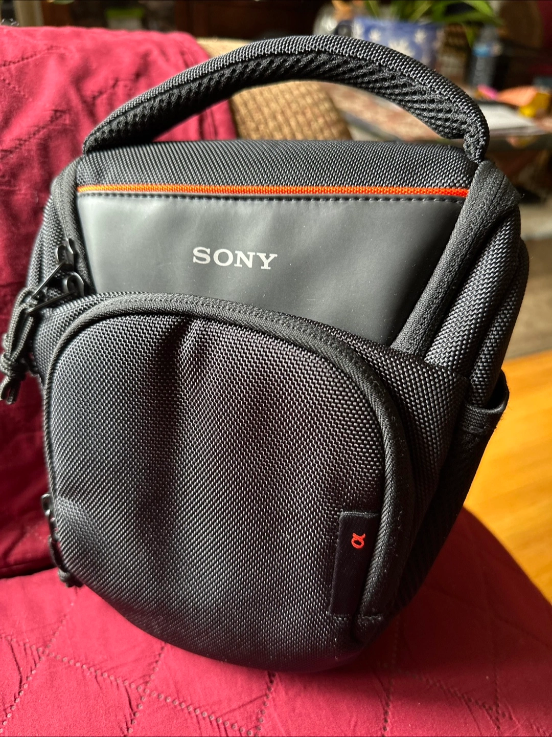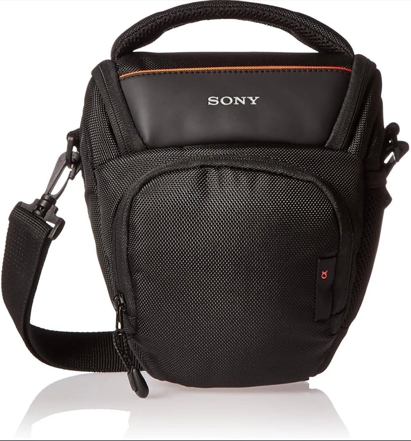 A black bag. It features an interior orange lining. It has a front pocket. NO SHOULDER STRAP. Designed to fit specific Sony Alpha cameras, including models ILCE7, ILCE7M2, ILCE7S, ILCE7R, ILCE7RM2, ILCE7SM2, ILCA77, and ILCA68. Includes additional storage for media and a lens cap. This bag could be a great way to protect your camera gear from damage.
