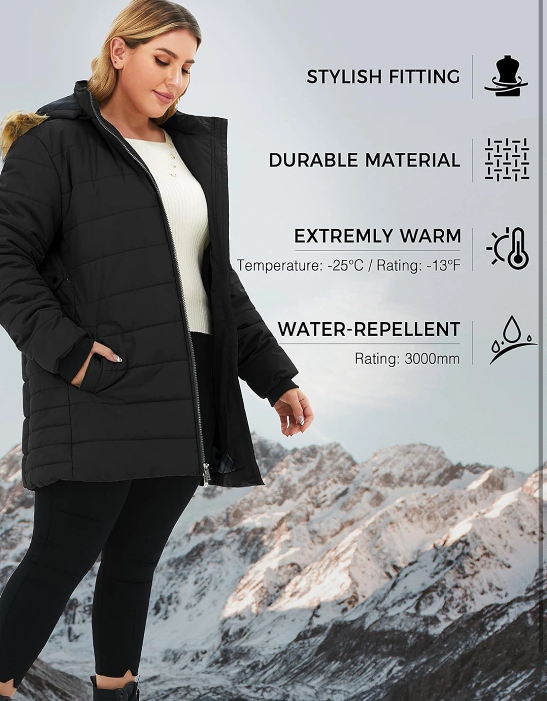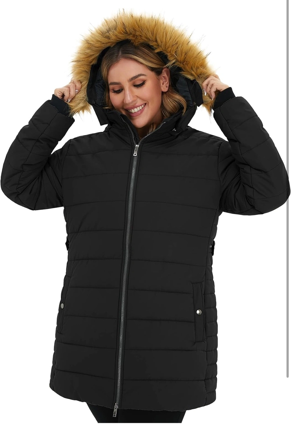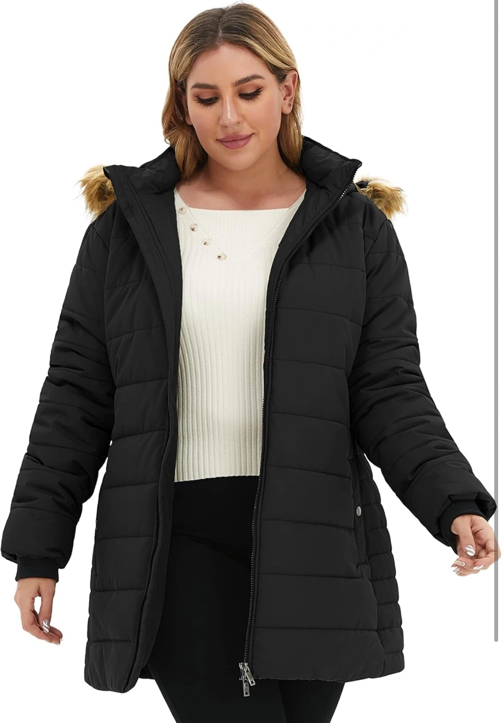 New! Retails for $130 SUPERIOR WARMTH & NOT HEAVY -- Quilted with high compressible and washable synthetic fiber, this hooded plus-size winter coat locks the heat efficiently without the extra heavyweight. It keeps you warm and moves easily in winter . Furthermore, the faux fur hood, stand collar, and ribbed sleeve cuff help against chilly air outdoor. KEEP YOU DRY CONSTANTLY -- This warm women's plus-size coat chose the outer fabric with 3000mm waterproof finish and transparent membrane that defend against the snow and light rain and keep you dry and comfortable. PRACTICAL HOOD AND POCKETS -- Faux fur trim attached on the button closure hood by zipper.It enhanced warmth of this plus-size puffer coat in winter. Button snap side pockets keep your valubles from losing, the fleece pocket lining could warm your hands at the same time. FLATTERING SILHOUETTE FOR PLUS -- Tailored to plus women shapely figure, this ladies plus size winter coat are also excellent in both fit and comfort, no bulky and shapeless. WEARING FLEXIBLE FOR WINTER OUTDOOR -- This plus-size women's coat is made ultra-warm and lightweight. It move flexibly and is perfect for those who love outdoor activities, like hiking, traveling, skiing, snowboarding, camping, etc. Warm, water-resistant puffer jacket. Features a faux fur-trimmed hood, zipper closure, handwarmer pockets, inside pockets, and adjustable waistband. Stylish and durable.