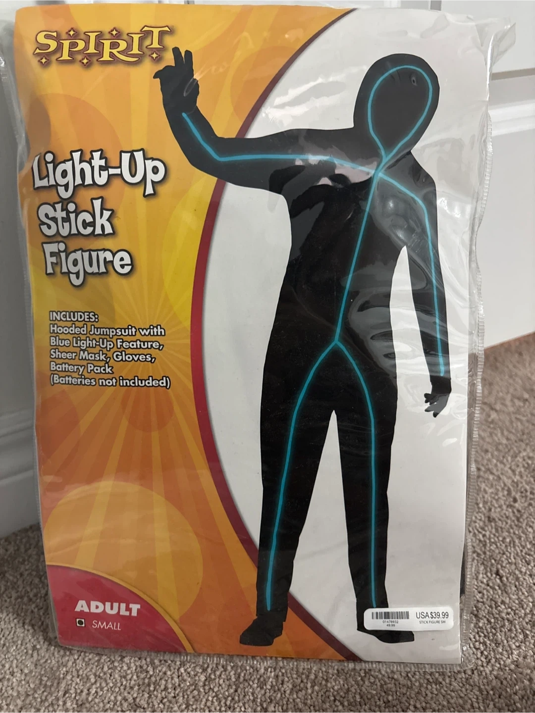 Selling a brand new Spirit Halloween Light-Up Stick Figure costume in adult size small! This fun costume includes a hooded jumpsuit with a blue light-up feature and sheer mask, gloves and batteries pack. Batteries are not included.