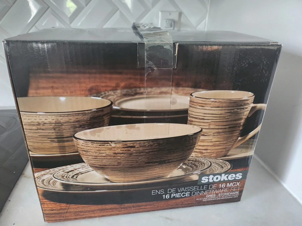Selling a brand new, still-in-box Stokes 16-piece dinnerware set in the Birch design! This set includes everything you need for a complete table setting. The box is included.