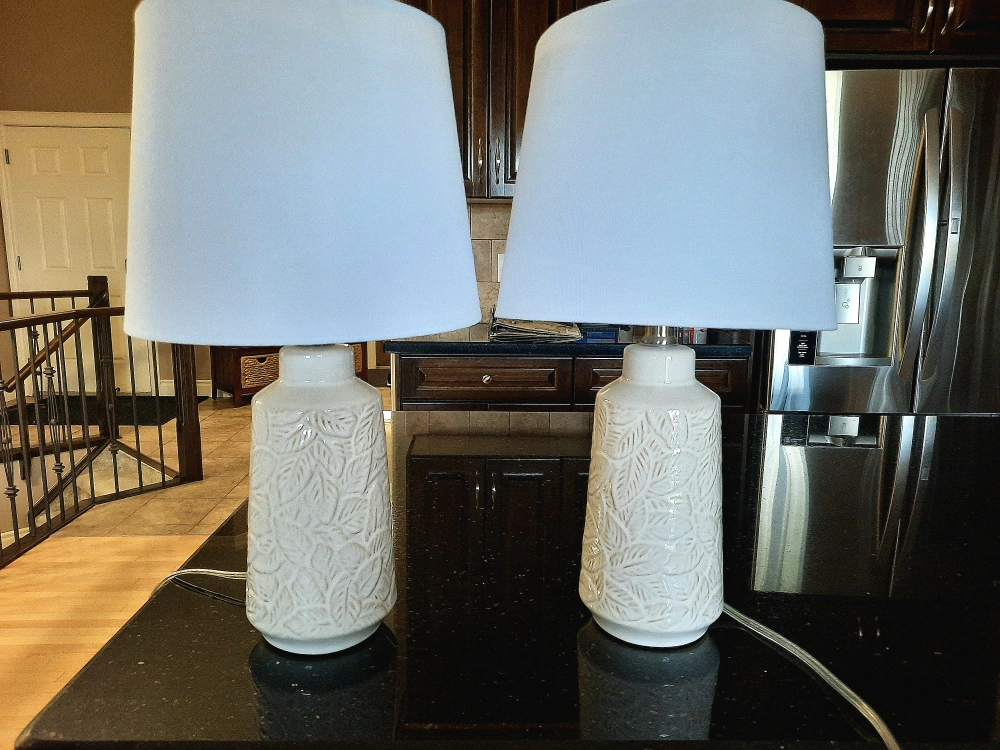 2 new table lamps, the bottom is ceramic with the leaf pattern and white lamp shades. Comes from smoke and pet free home. Pick up Bayside, Airdrie or Panorama Hills, Calgary. Please take a look at my other ads.