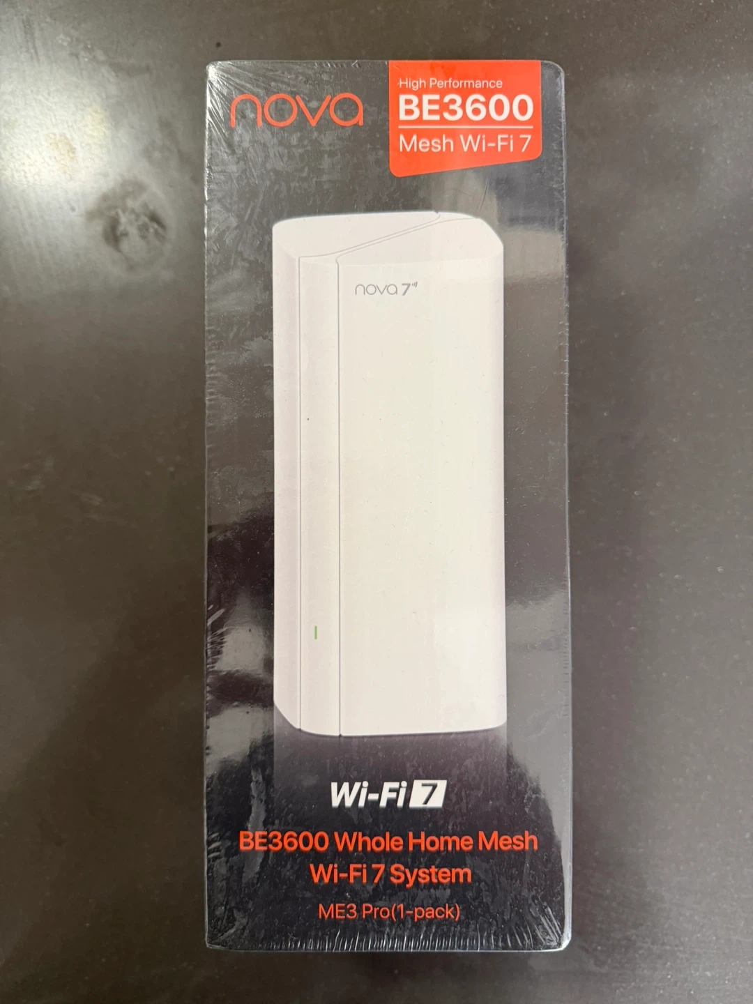 Selling a brand new Tenda Nova BE3600 Whole Home Mesh Wi-Fi 7 System! It's still in its original packaging. Key features include: - Speedy Wi-Fi 7 for better experience - Dual-band concurrent speed up to 3570 Mbps - Coverage up to 2500 sq.ft - 3 x Full Gigabit Ports - Connect 160+ Devices - Easy setup - Intelligent diagnosis - Parental controls Dimensions (L*W*H): 86x86x190mm (3.39x3.39x7.48 in)