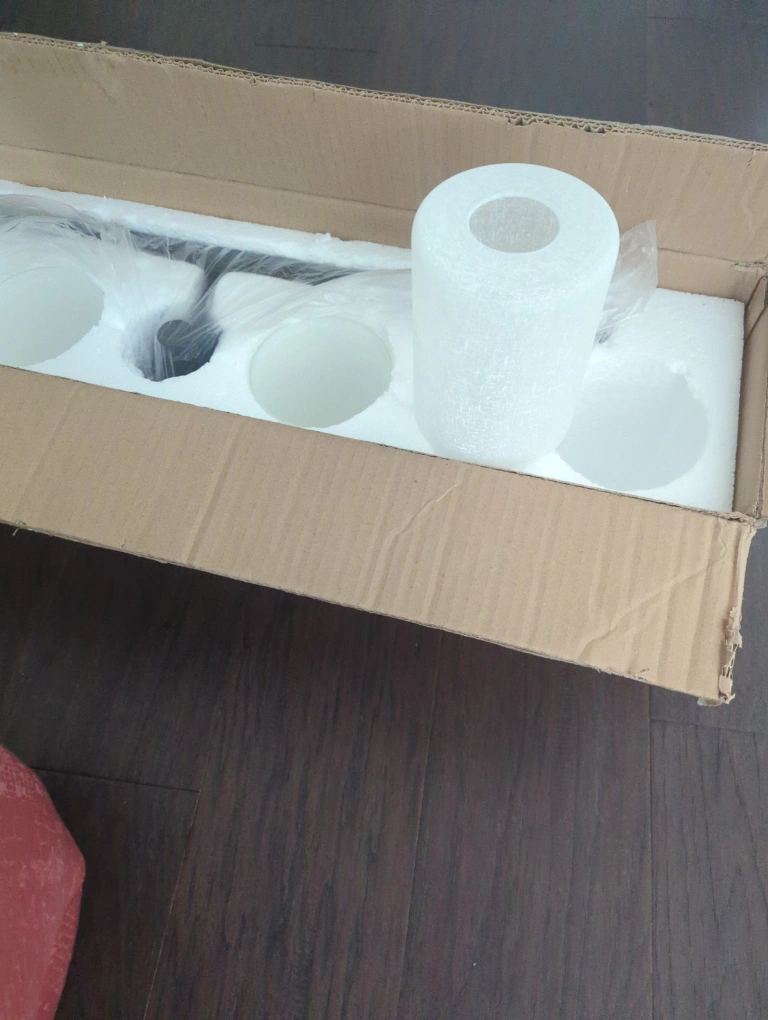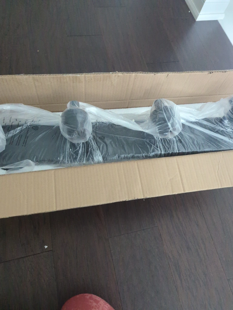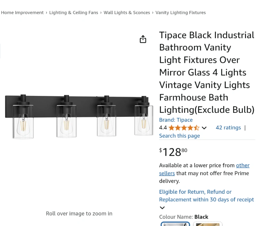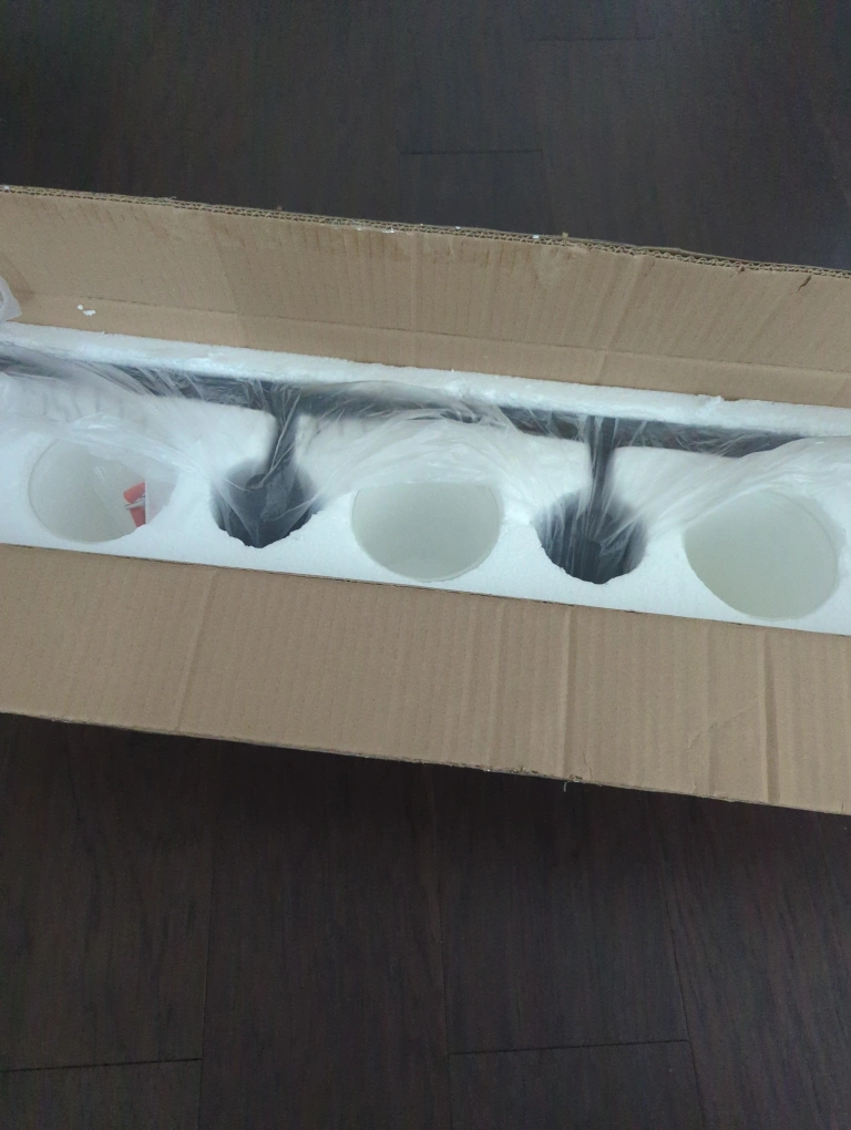 Four light vanity bar. Black metal frame. Frosted glass shades. Farmhouse style. New in box. Excludes bulbs.