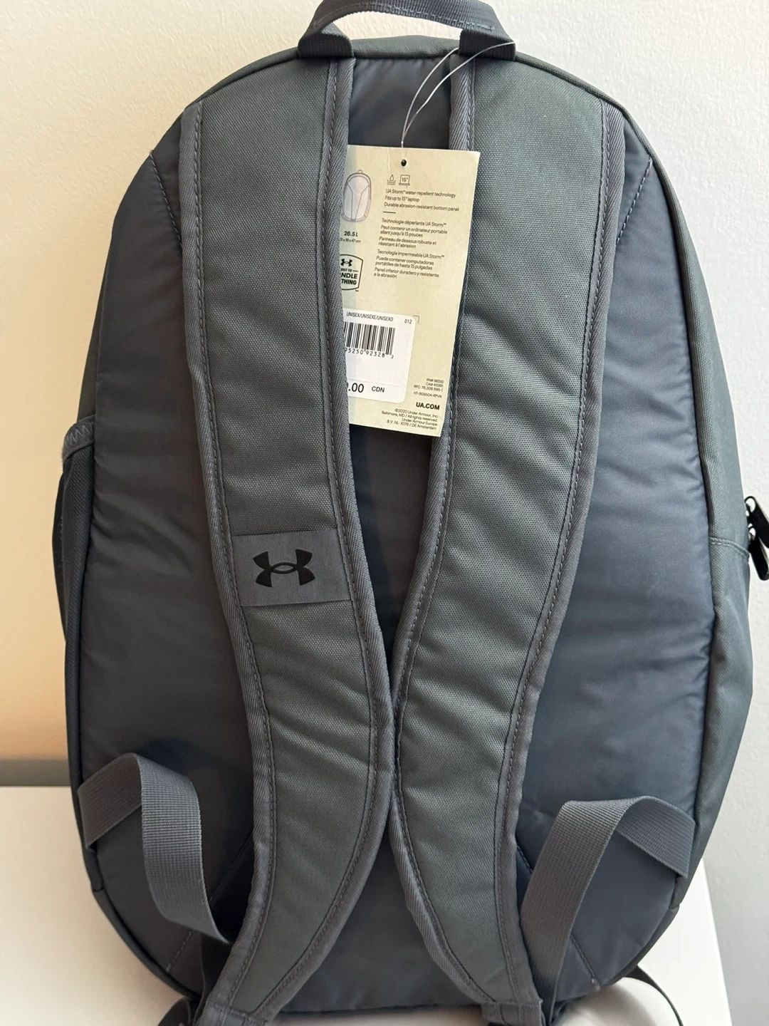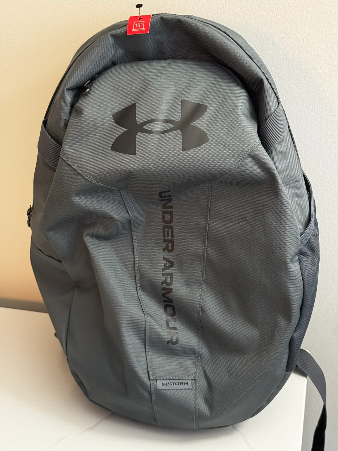 This Under Armour HUSTLE STORM backpack is brand new with tags still attached! It's a stylish grey colour and features the Under Armour logo. The HUSTLE STORM technology makes it water-resistant, perfect for everyday use or outdoor adventures. It's a great backpack for school, work, or travel!
