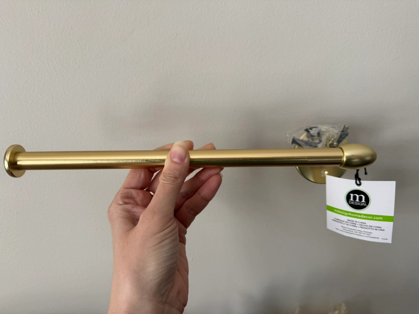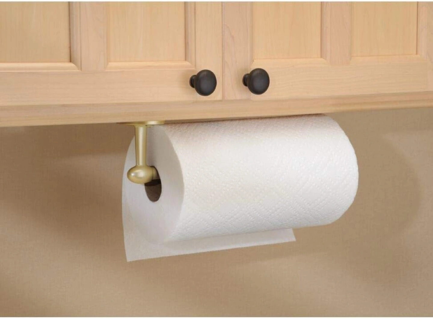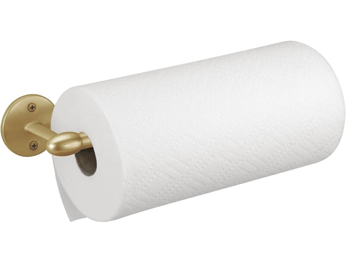New Gold under cabinet paper towel holder. Mounts under cabinets. Sleek and stylish design. Durable metal construction. Includes mounting hardware. Only available for pick up