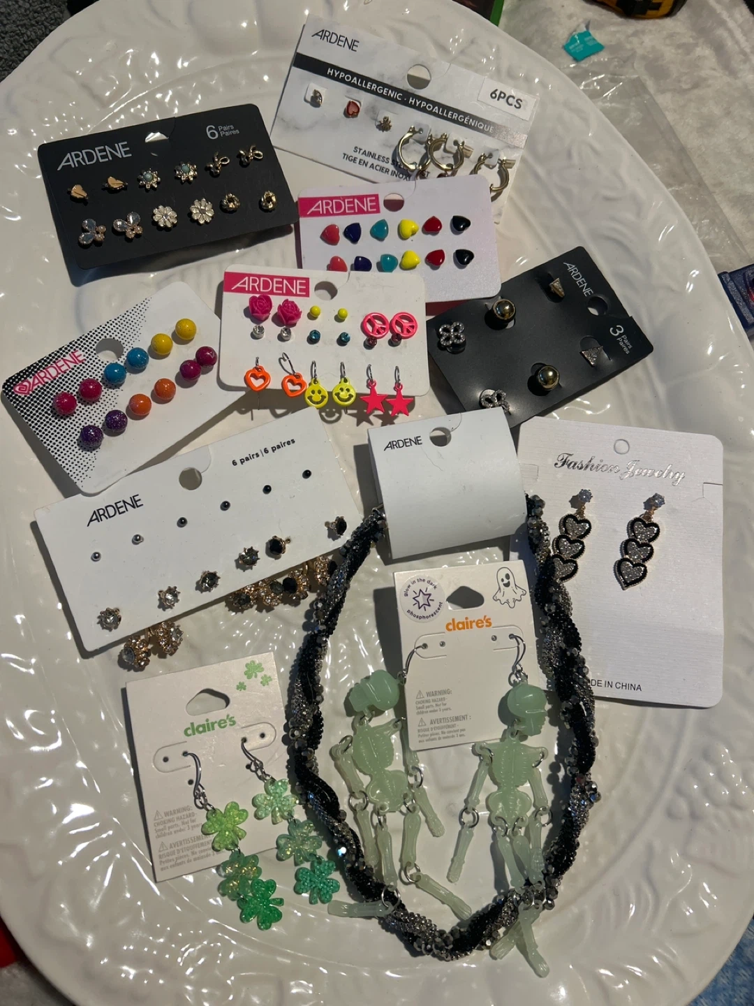 A bunch of earrings from Ardene and Claire's! There are multiple sets with different designs, including some glow-in-the-dark skeleton earrings from Claire's and various stud sets from Ardene. Perfect for adding some variety to your jewelry collection All have never been worn. Pick up and cash only Listing as “like new” due to some sets containing pairs from another set. My daughter would buy the six pack just for one pair. Yeap. $7-$9 dollars per pack just for ONE pair. 😤