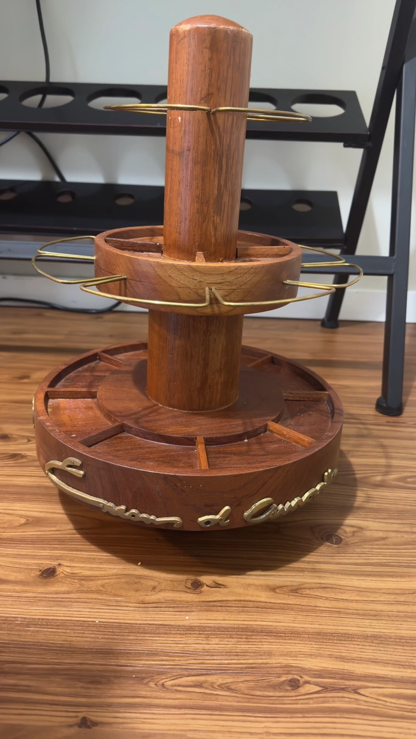 NEW Wooden Crown Royal liquor dispenser. Two tiers with slots and brass wire holders. Features Crown Royal branding. Only available for pick up.