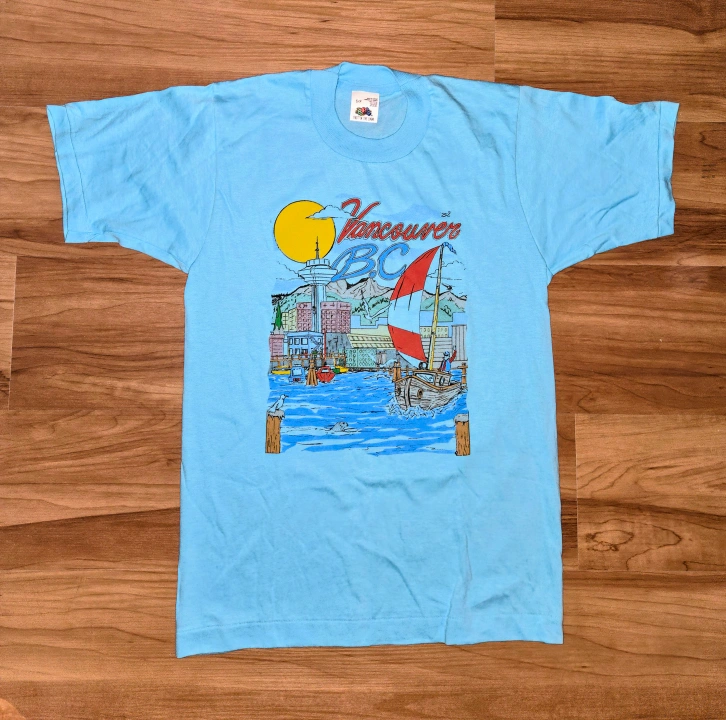 Selling a true vintage Vancouver BC T-shirt from the 90"s. It's a light blue colour with a graphic of Vancouver's skyline and a sailboat. Great for anyone who loves Vancouver! - brand new with tags - 100% cotton, excellent vintage quality and fit! - Size Sm, unisex - Fruit of the Loom - made in Canada! π¨π¦ - I have 2 of these - can also meet in Fairview ββ My family had a Tshirt Business in the 80's & early 90's. This is left over stock. Check my page often for LOTS more Adult's & Children's Tshirts to come! ββ