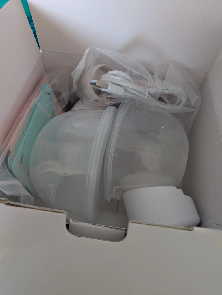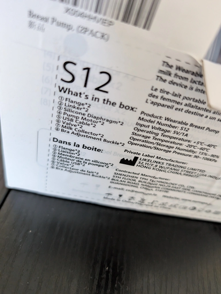 Selling a new, wearable breast pump (2 pack). Model number is S12. The box includes: - Flange *2 - Linker *2 - Silicone Diaphragm *2 - Pump Motor *2 - USB cable *2 - Valve *2 - Milk Collector *2 - Bra Adjustment Buckle *2