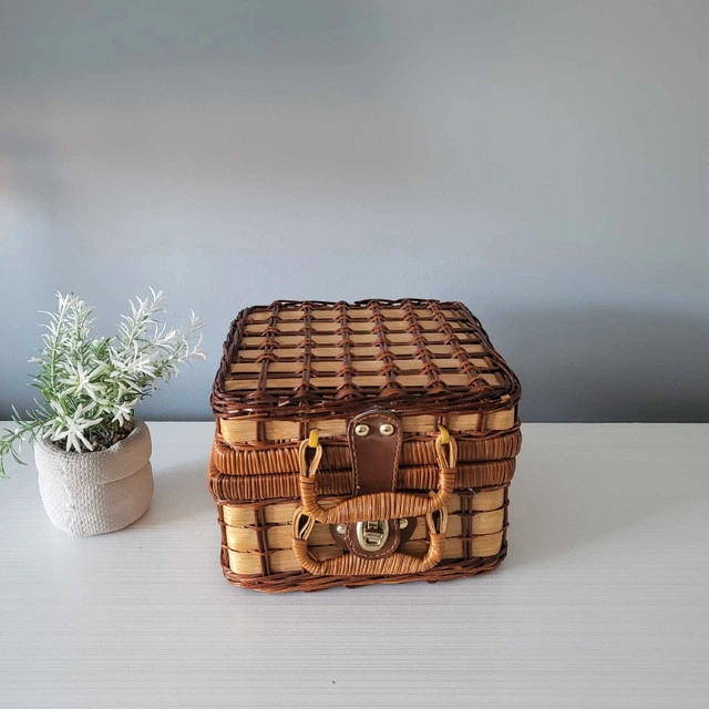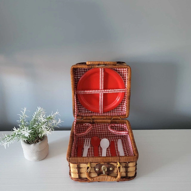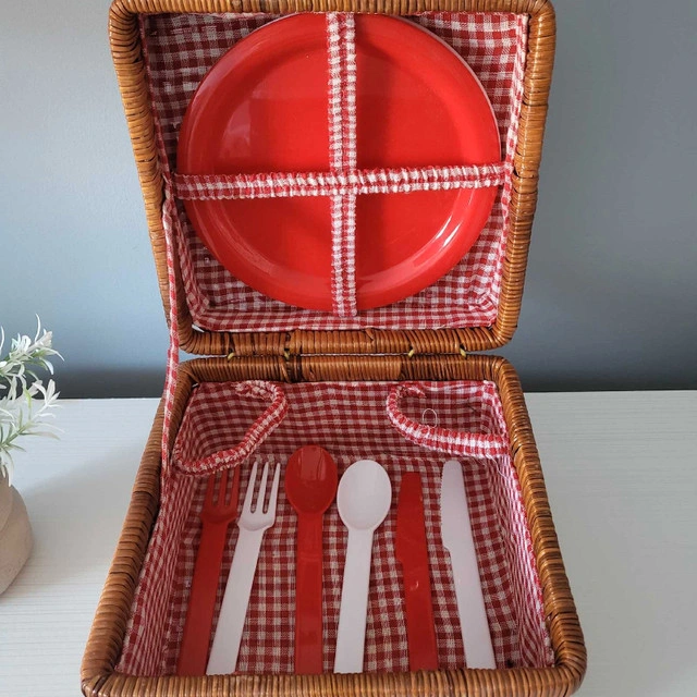 I'm hoping to sell this wicker picnic basket! I've been cleaning out my basement and found this gem!💎 -2 knives, 2 forks, 2 spoons, 2 plates -Sadly the 2 plastic cups are missing -5"H x 8"W x 7"D -Insulated interior -Plenty of storage -Made of wicker -Carry strap -Pickup today!🚀 -Audley Rd and Bayly St!📍 -Checkout my reviews!⭐️ Let me know if you have any questions or offers. Thanks!
