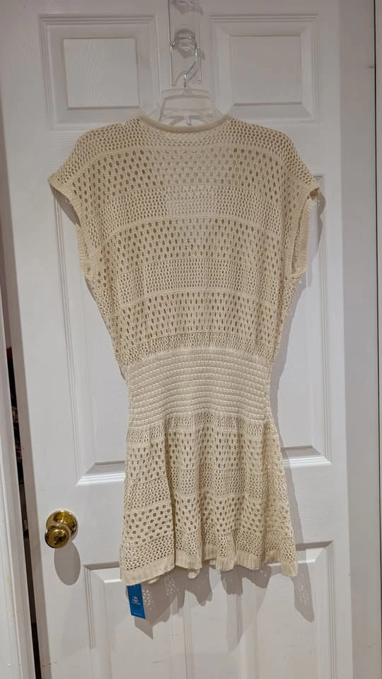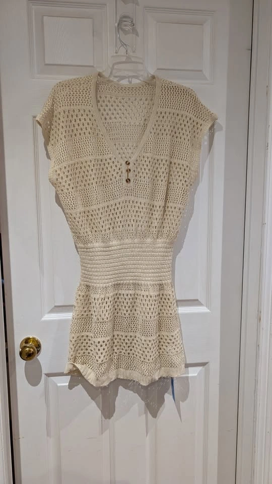New Tag On Cupshe Cover-Up Mini Dress Beige Size Large Head to the beach in style with the Beige Crochet V-Neck Short Sleeve Cover-Up Mini Dress! Featuring front buttons, a V-neckline, and an elastic waist for a flattering fit, this breezy piece adds an effortless vibe to your sunny days. Features: Knit V-neckline Short sleeves Front buttons Mini Material: 100%POLYESTER Wash Method: Regular Wash