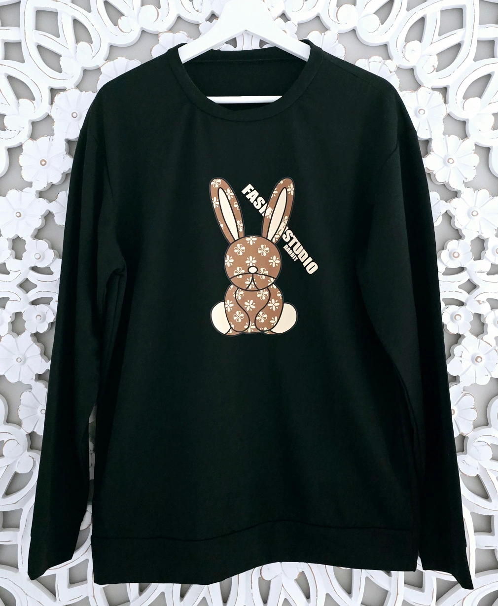 New with tag Black long-sleeved sweatshirt. Features a brown bunny graphic on the front. Crew neck.