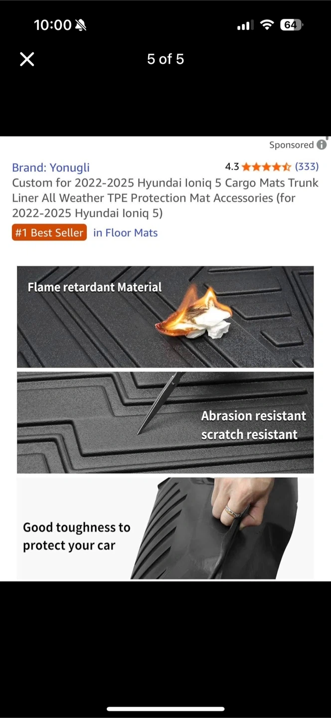 Selling a brand new Yonugli custom cargo trunk liner for a 2022-2025 Hyundai Ioniq 5! It's an all-weather TPE protection mat accessory. It's flame retardant and abrasion resistant, with good toughness to protect your car
