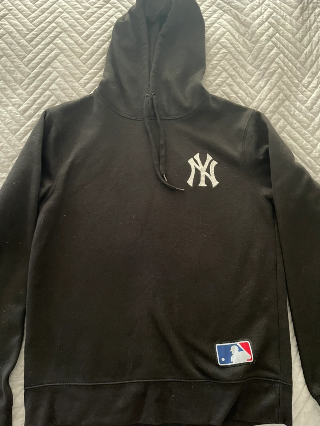Selling a New York Yankees hoodie in black. It features the classic Yankees logo on the front and the MLB logo on the sleeve. Great for any baseball fan!