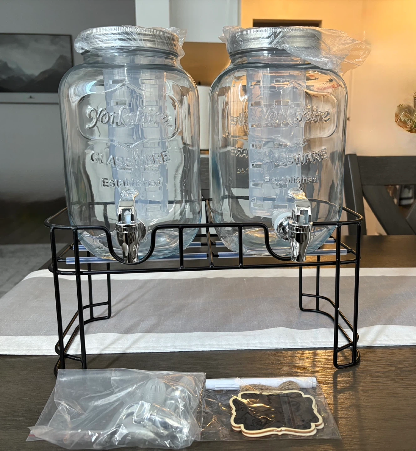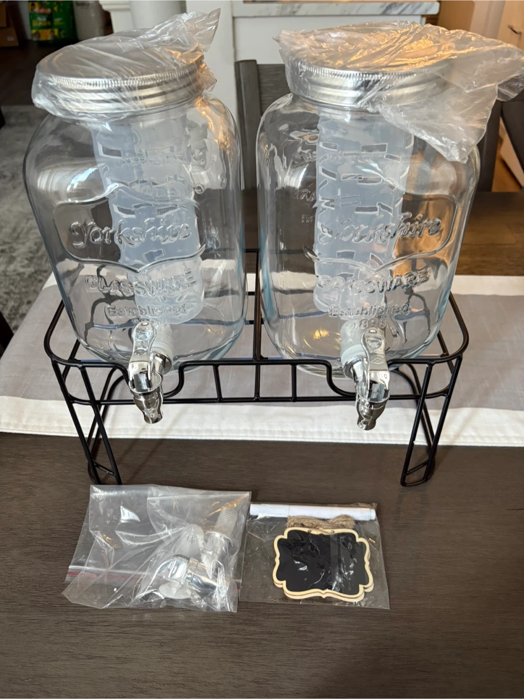 Selling a Yorkshire Glassware double beverage dispenser with removable fruit infuser and extra tap ! It's perfect for parties or gatherings. Includes the stand, two dispensers, and a small chalkboard sign.