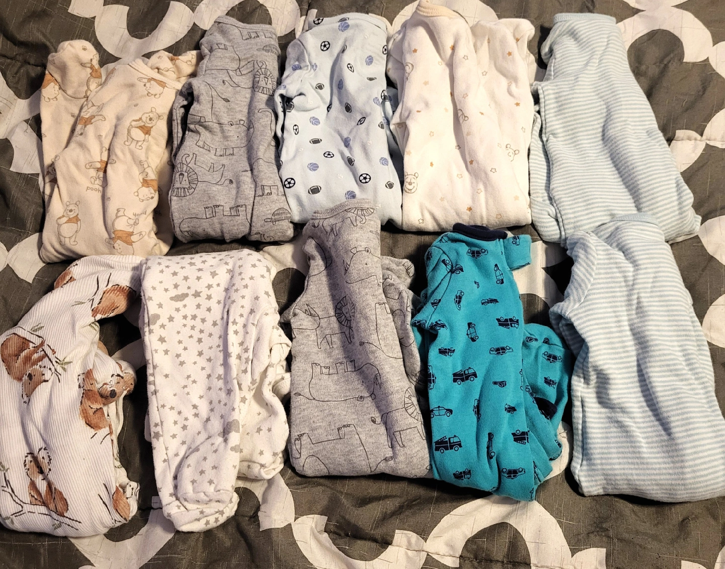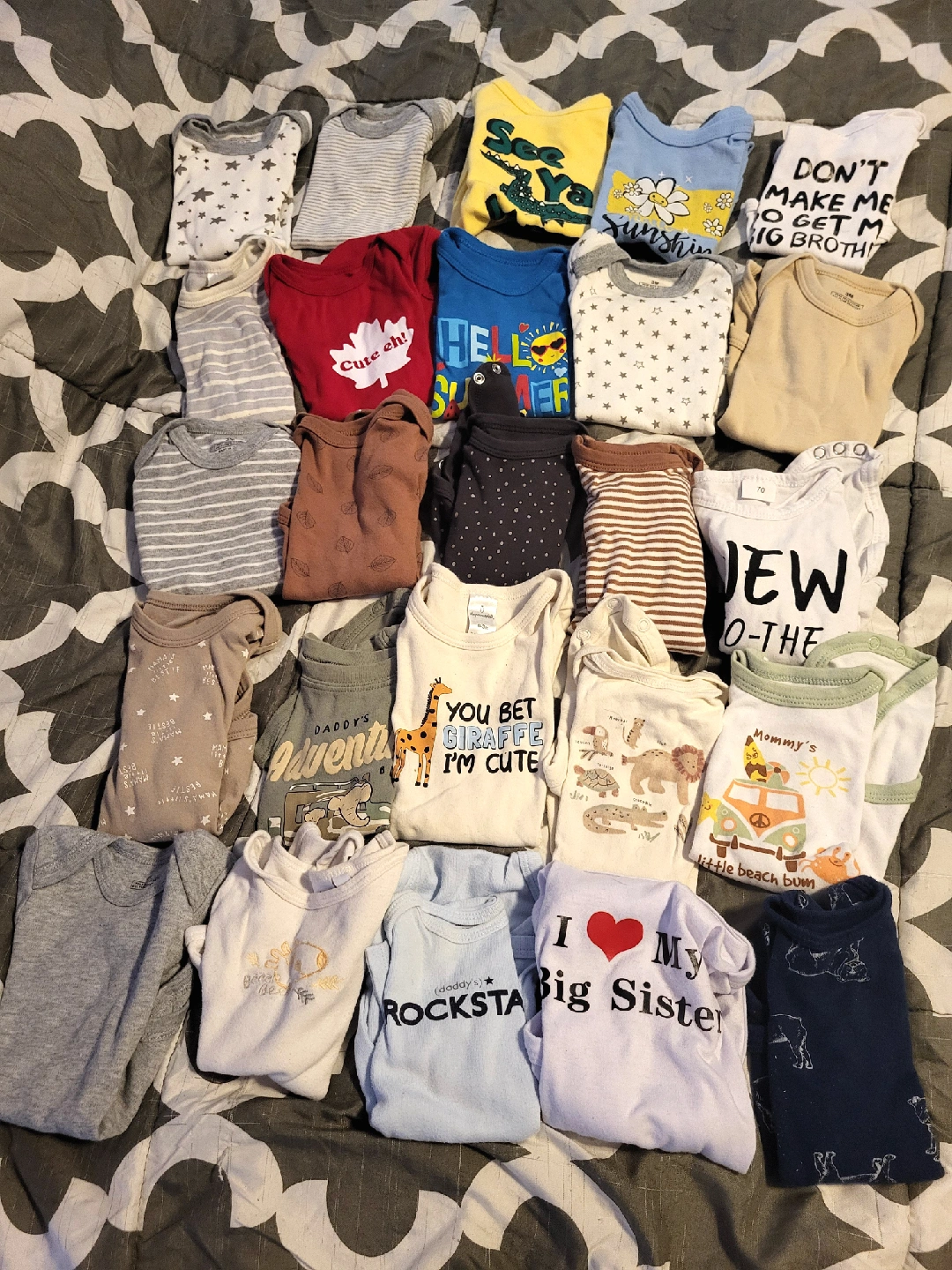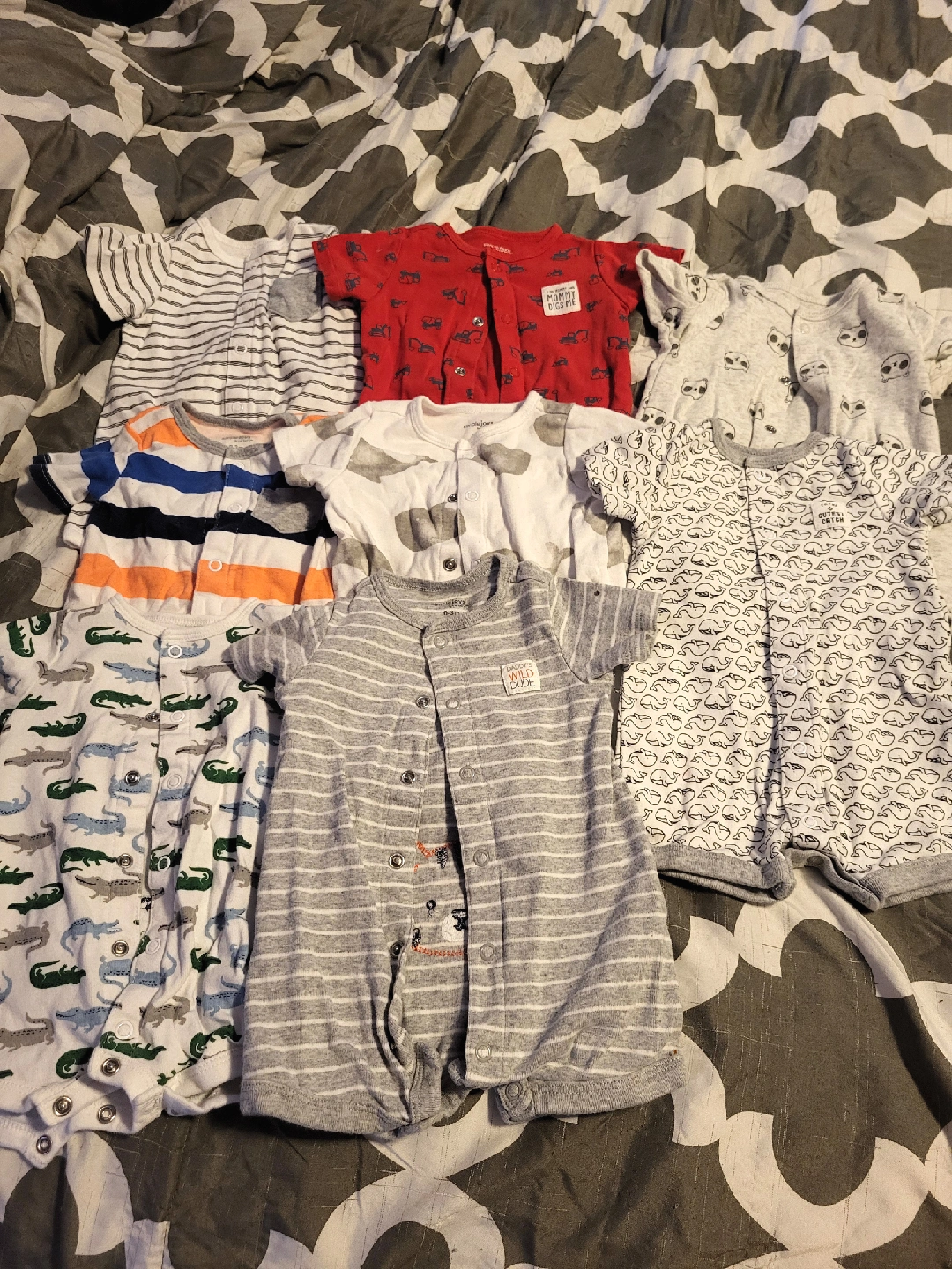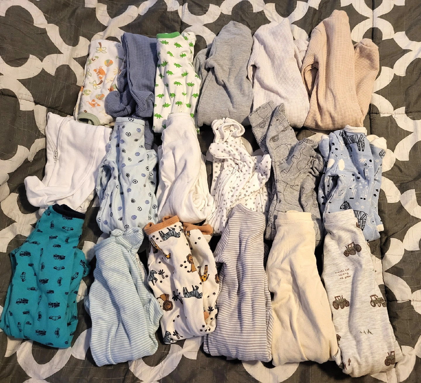 NB PJ - 10 NB Rompers - 2 0-3 months Overalls -2 Sweaters - 2 Rompers - 8 Short sleeves - 25 Long sleeves - 11 Pants - 28