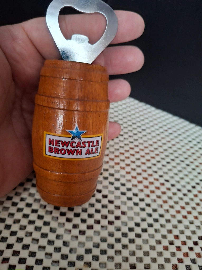 Selling a fun Newcastle Brown Ale bottle opener! It's shaped like a little wooden barrel with the Newcastle Brown Ale logo on the front. Perfect for your home bar or as a gift for a beer lover 12x5 cm