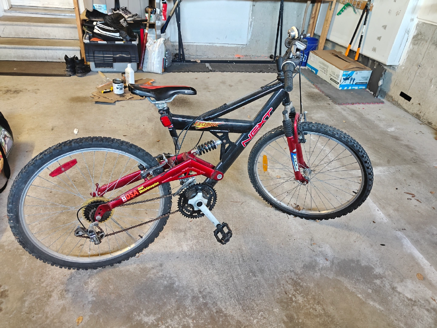 Selling a Next USA F2 Climber mountain bike! It's black and red, and looks like it's ready for some trails or just cruising around the neighbourhood. Want it gone to clear up some space in the house, thank you.