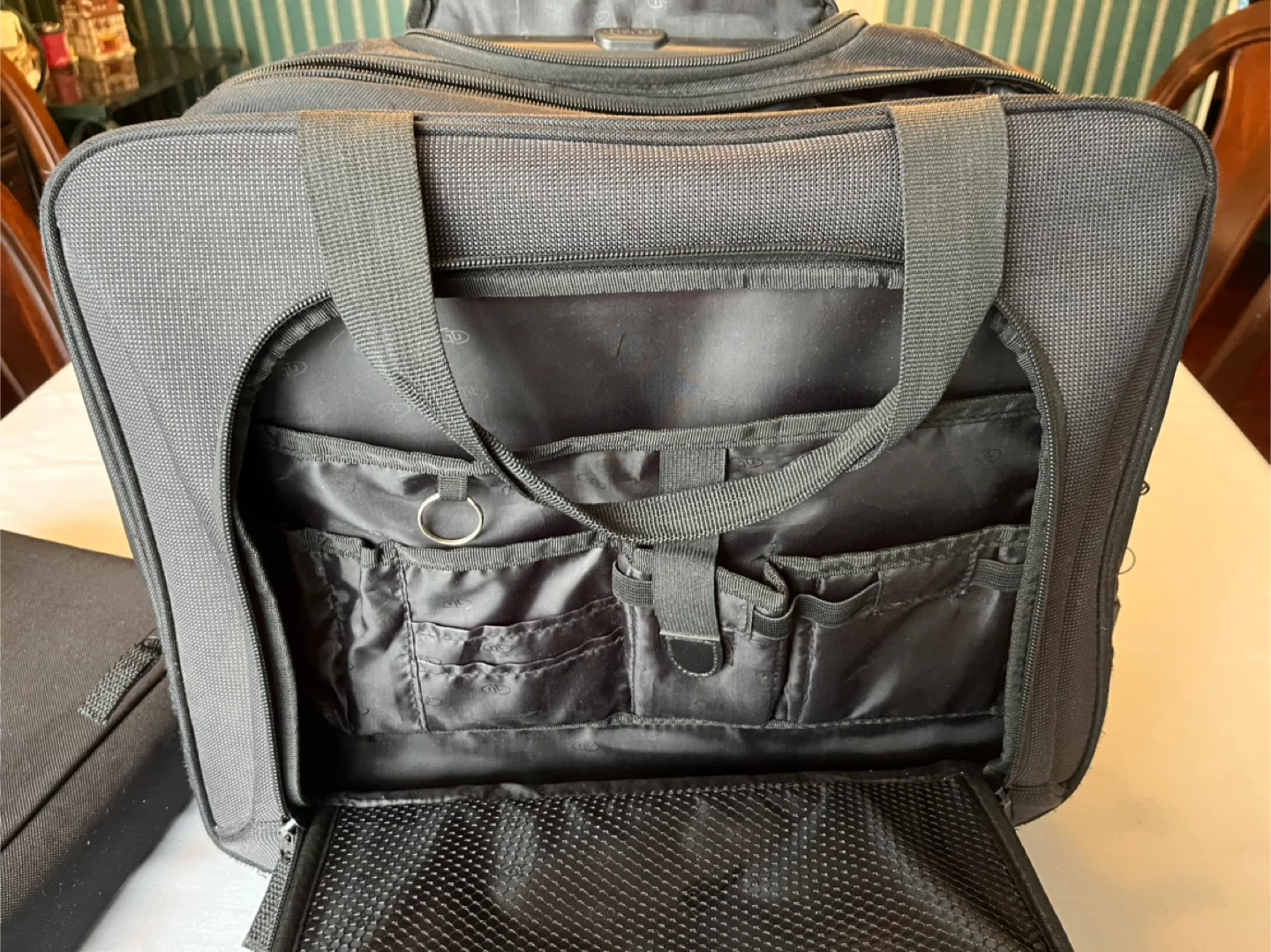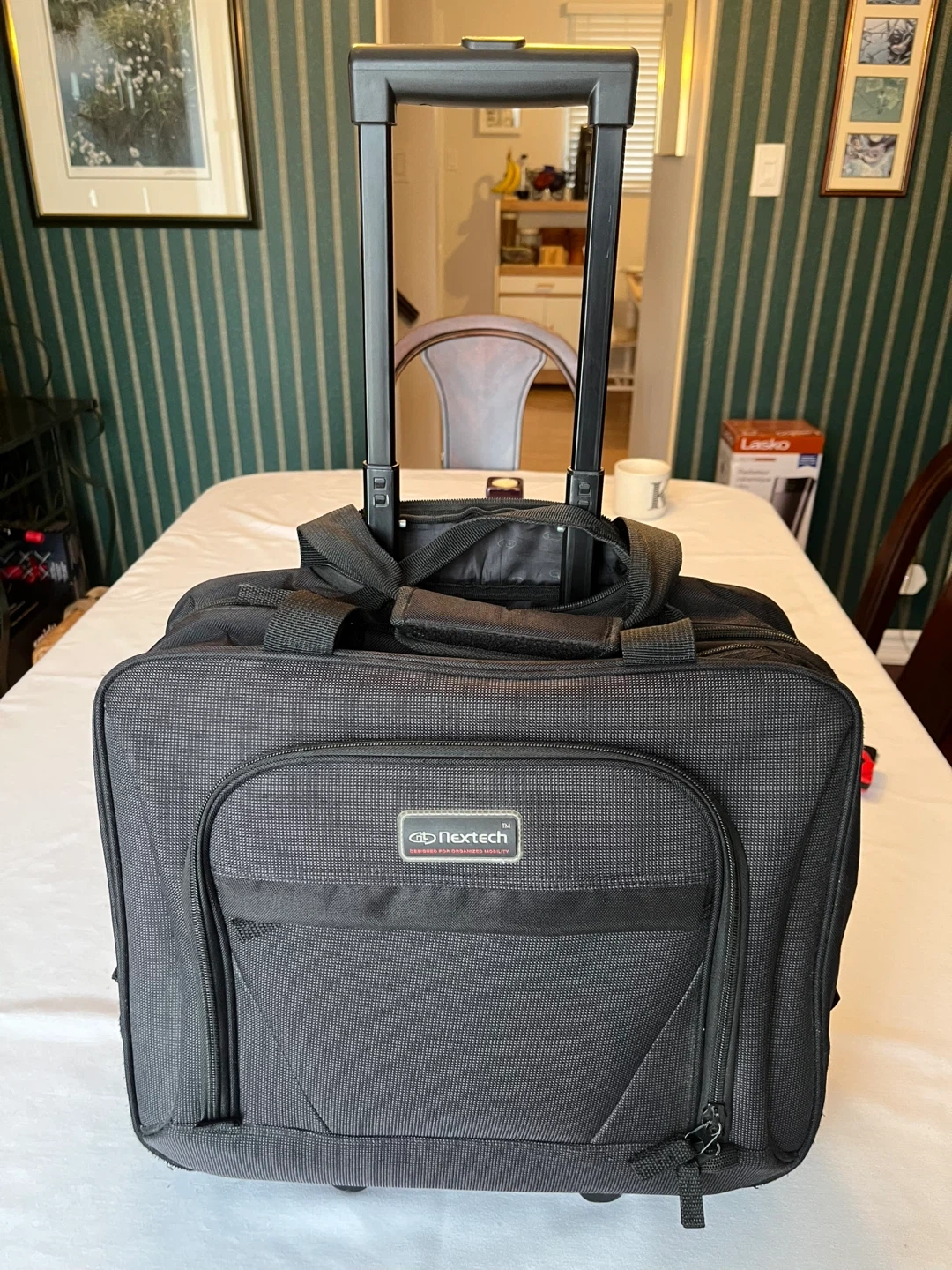 Selling a Nextech rolling travel bag in great condition! It's black and features multiple compartments for organization. Perfect for business trips or weekend getaways. The bag includes a telescoping handle and smooth-rolling wheels for easy transport
