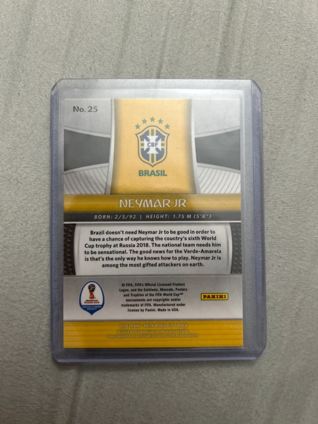 Selling a Neymar Jr. Prizm World Cup 2018 trading card! It's in great condition and features Neymar in his Brazil jersey. A must-have for any soccer fan or card collector!