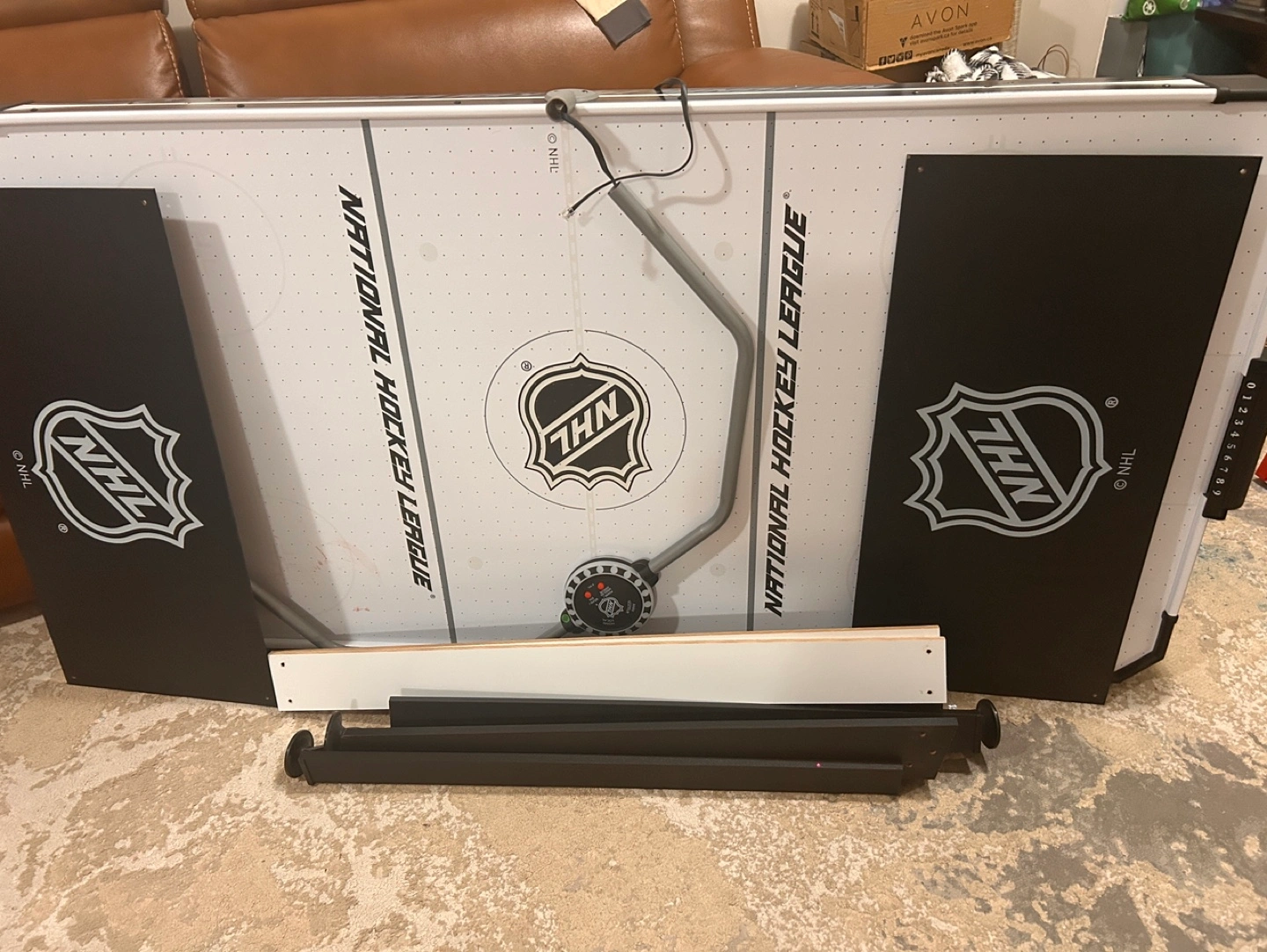 National Hockey League branded air hockey table. Only used for a week, in excellent condition. Some assembly required because I have un assembled. Minor damage to one side panel. Includes all hardware power supply and fan. Makes fun light and sound when goal is scored!!!