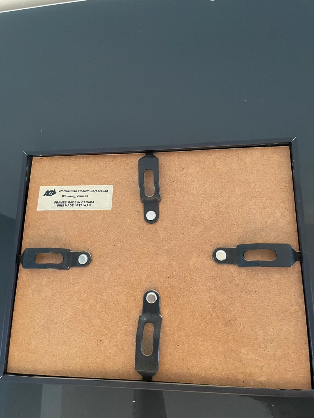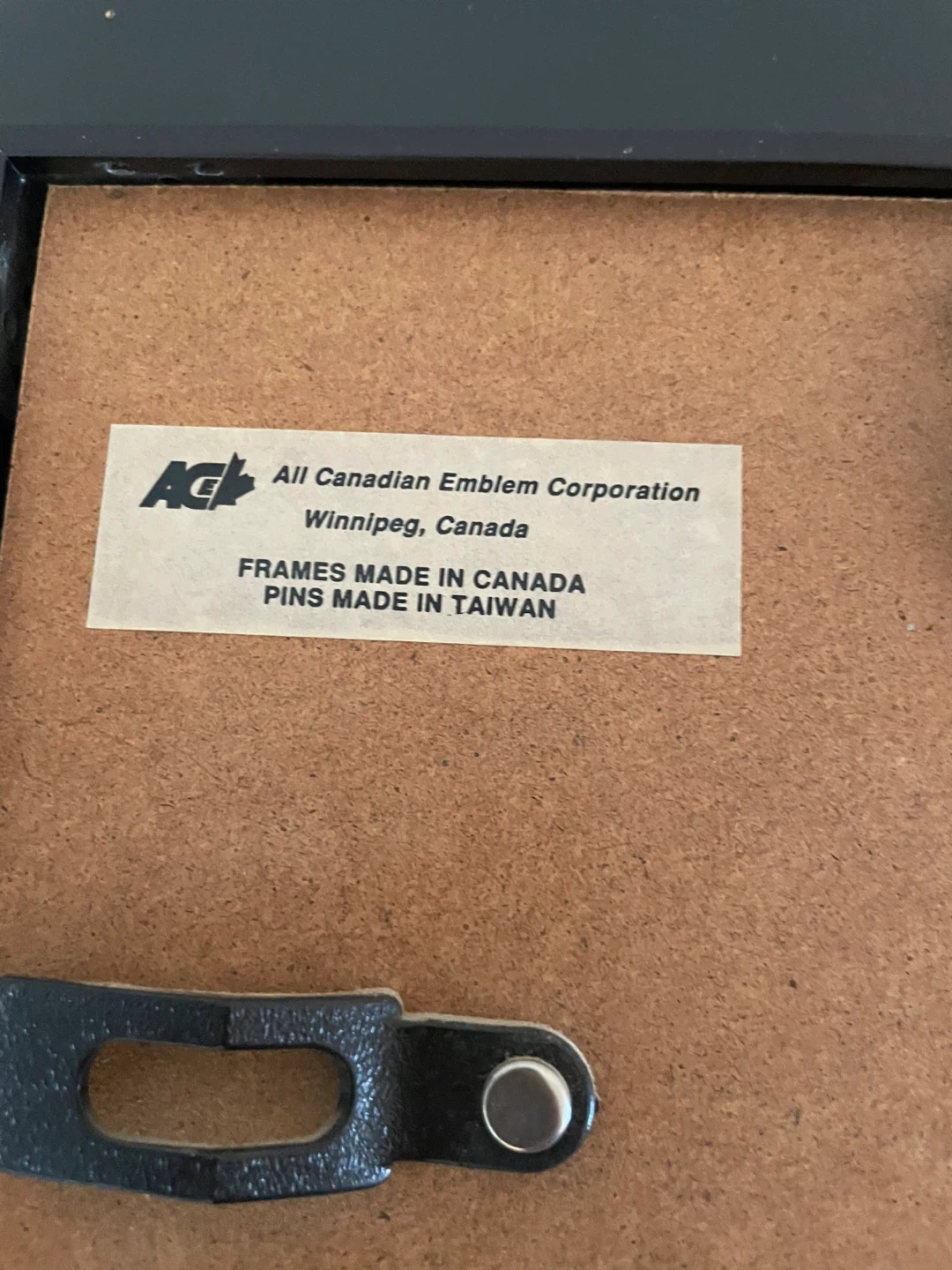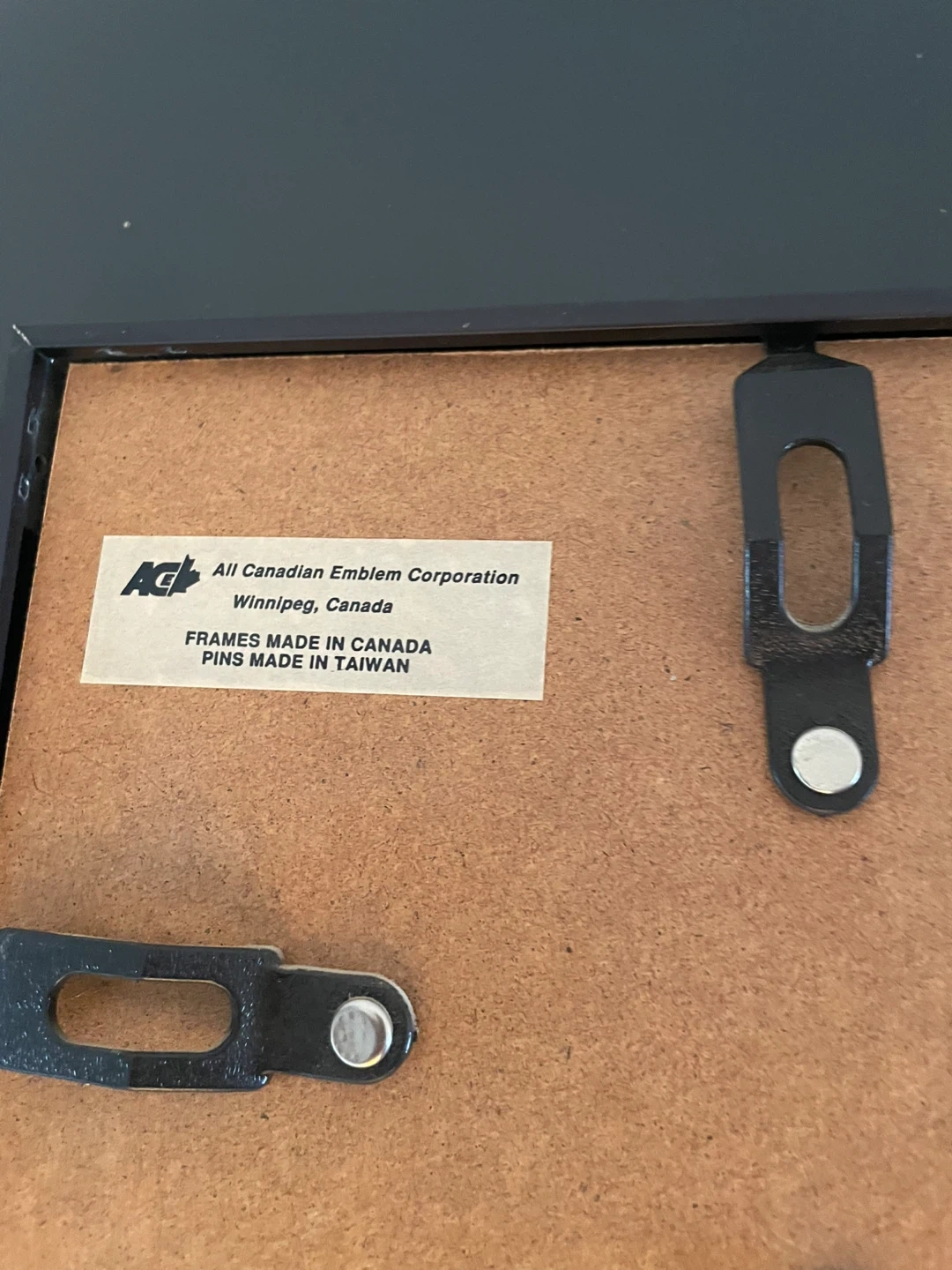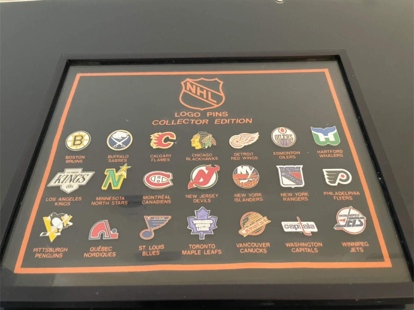 Selling a framed collector's edition of NHL logo pins. The frame was made in Canada by All Canadian Emblem Corporation. Pins were made in Taiwan. Great for any hockey fan!