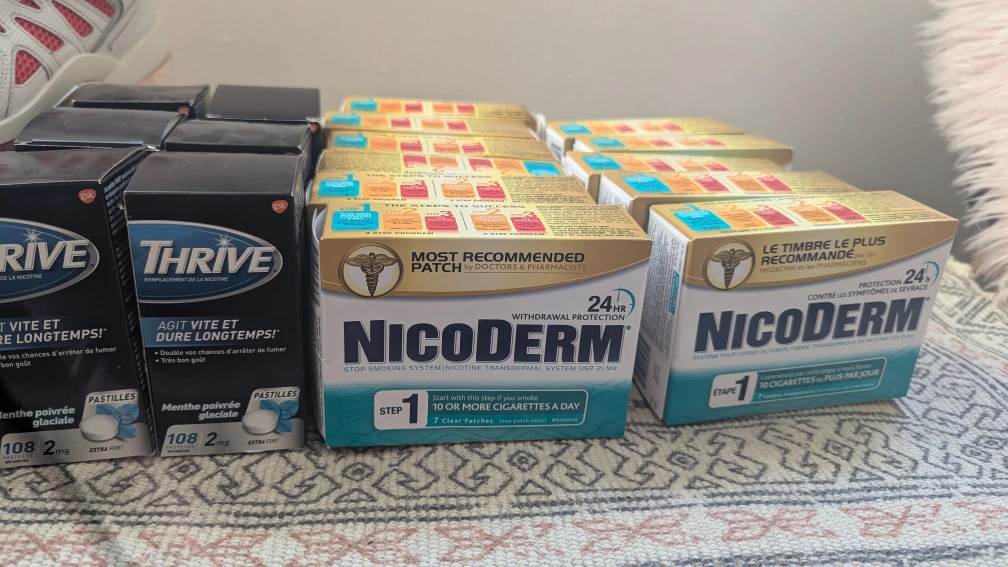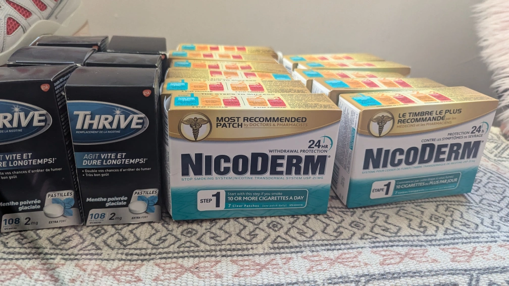 I have Nicoderm patches and Thrive pastilles for sale. Nicoderm: Step 1, 7 clear patches, 21 mg Thrive: Menthe poivrée glaciale, 108 pastilles, 2 mg extra fort unopened un used 6 boxes of lozenges, and 11 boxes of patches. helped me quit smoking, hopefully can help you too.