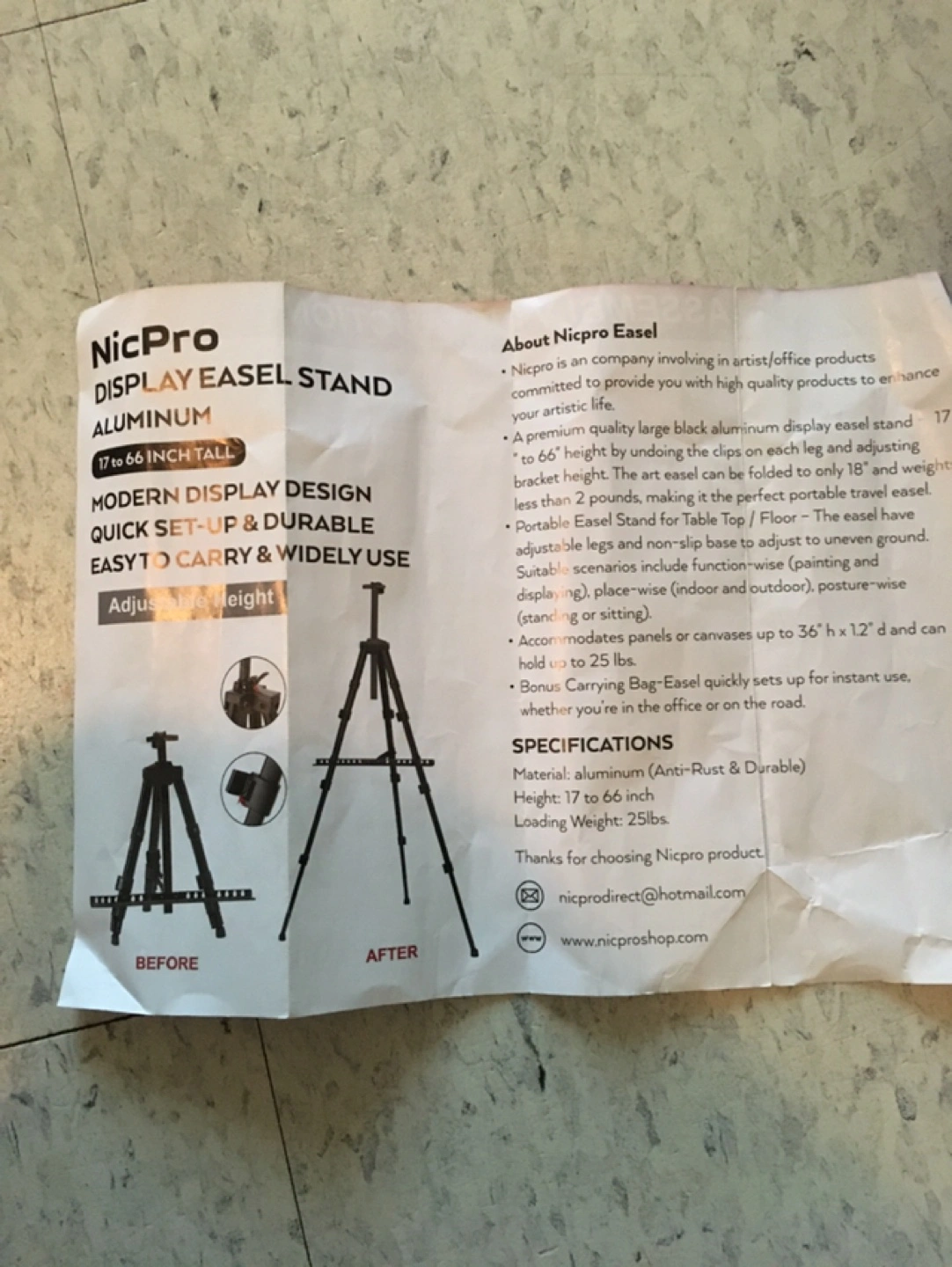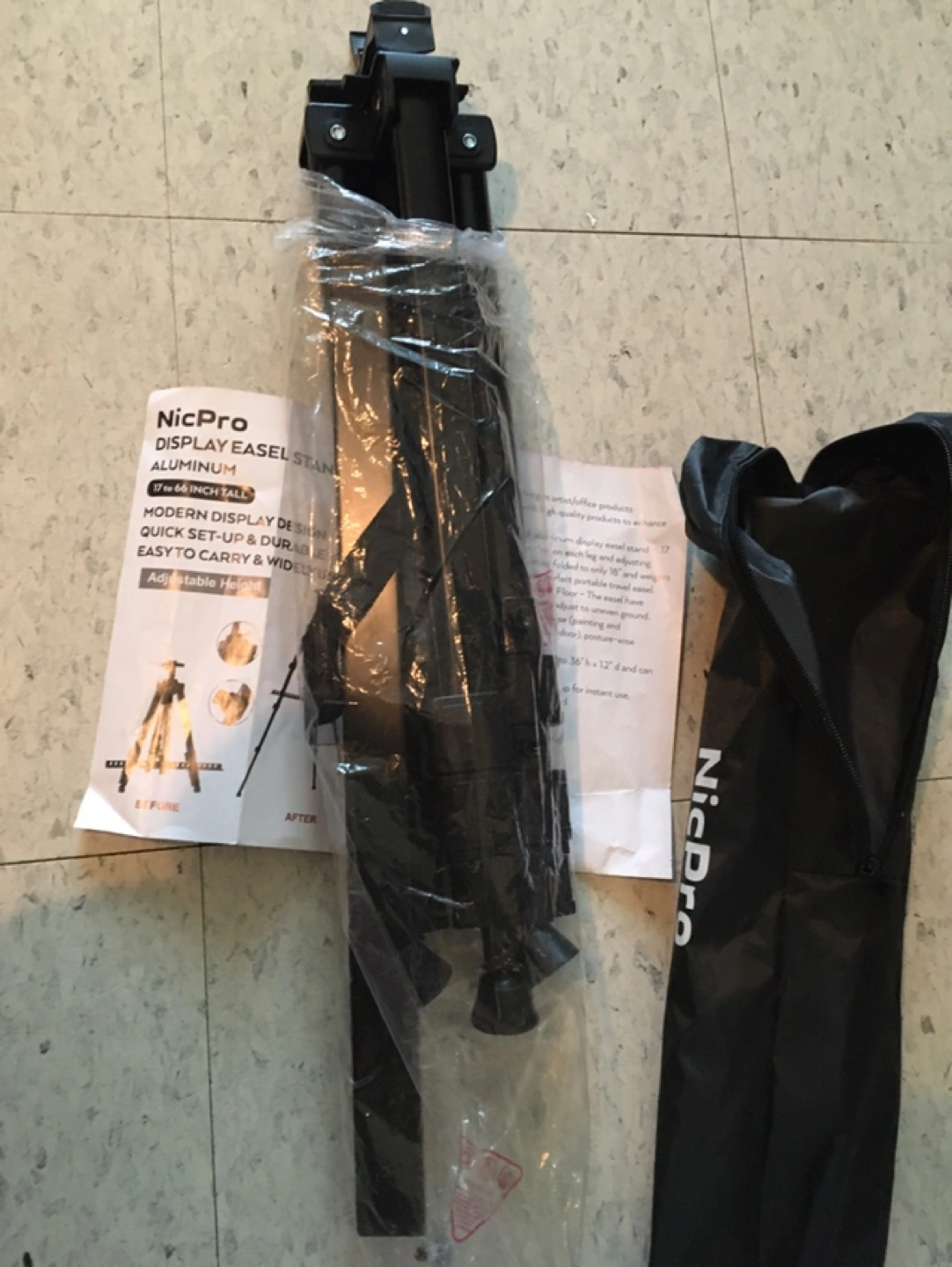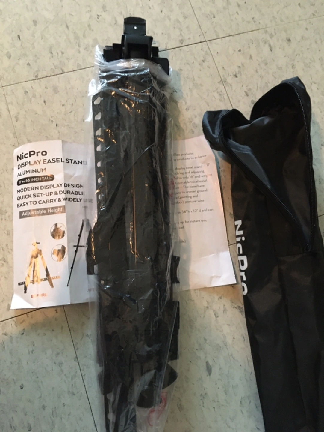This NicPro display easel stand is made of aluminum and is adjustable from 17 to 66 inches tall. It's designed for modern display and is quick to set up and durable. It's also easy to carry and wide base for support. Accessories include: tripod, vertical bar, horizontal bar, and travel bag Looks like it only holds up to 35 inches canvases Pick up:toronto down town west(adelaide and niagara)