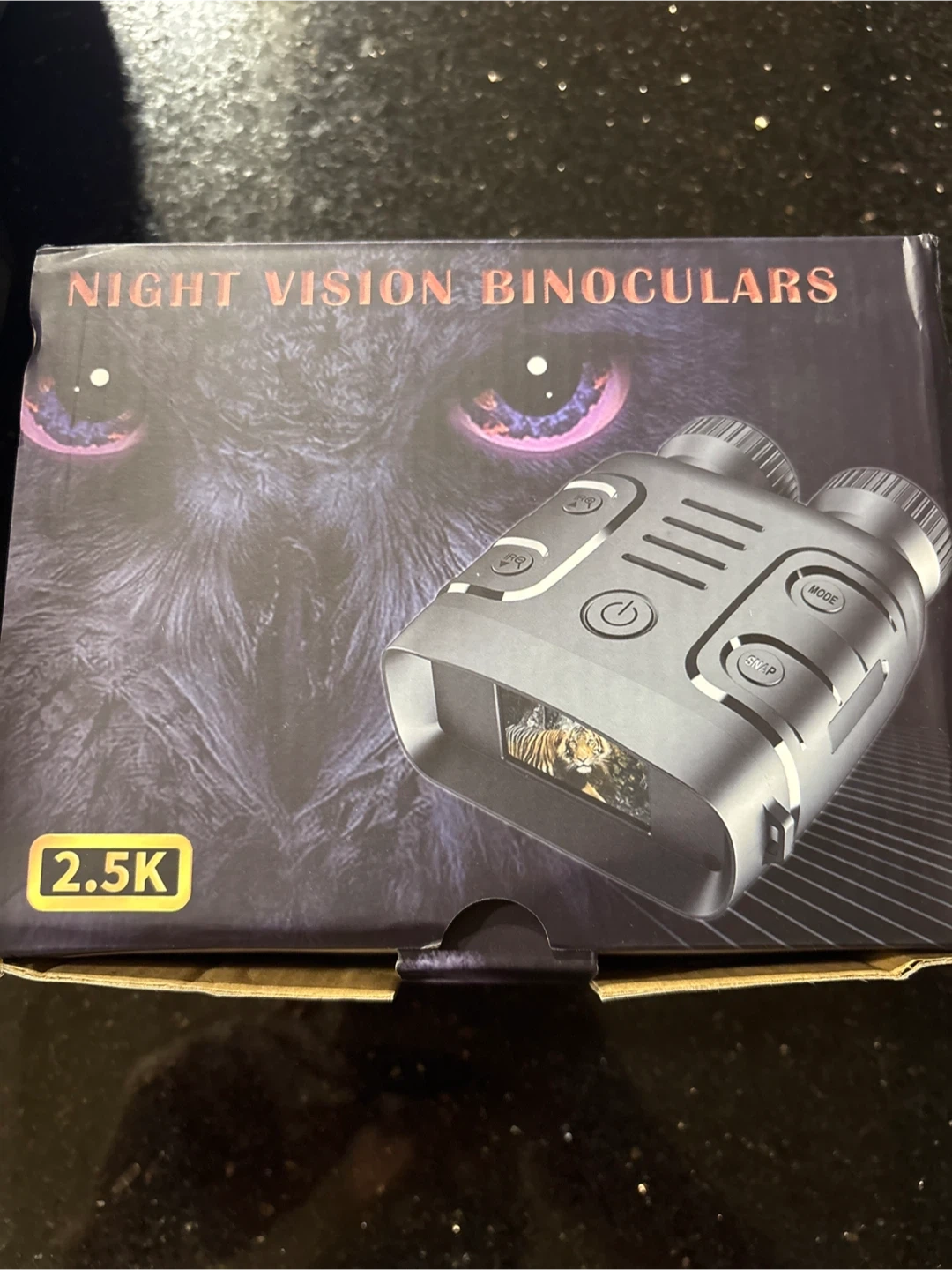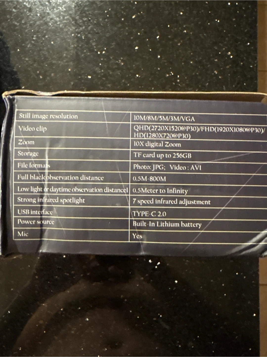 Selling a pair of night vision binoculars! The box includes the following specs: - Still image resolution: 10M/8M/5M/3M/VGA - Video clip: QHD(2720X1520@P30)/FHD(1920X1080@P30)/HD(1280X720@P30) - Zoom: 10X digital zoom - Storage: TF card up to 256GB - File formats: Photo: JPG; Video: AVI - Full black observation distance: 0.5M-800M - Low light or daytime observation distance: 0.5 Meter to Infinity - Strong infrared spotlight: 7 speed infrared adjustment - USB interface: TYPE-C 2.0 - Power source: Built-In Lithium battery - Mic: Yes