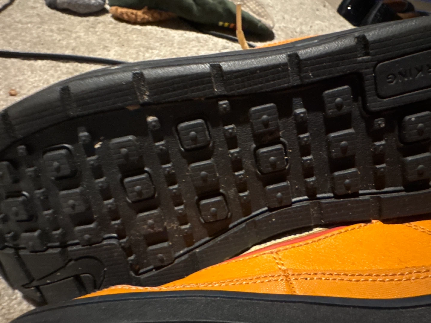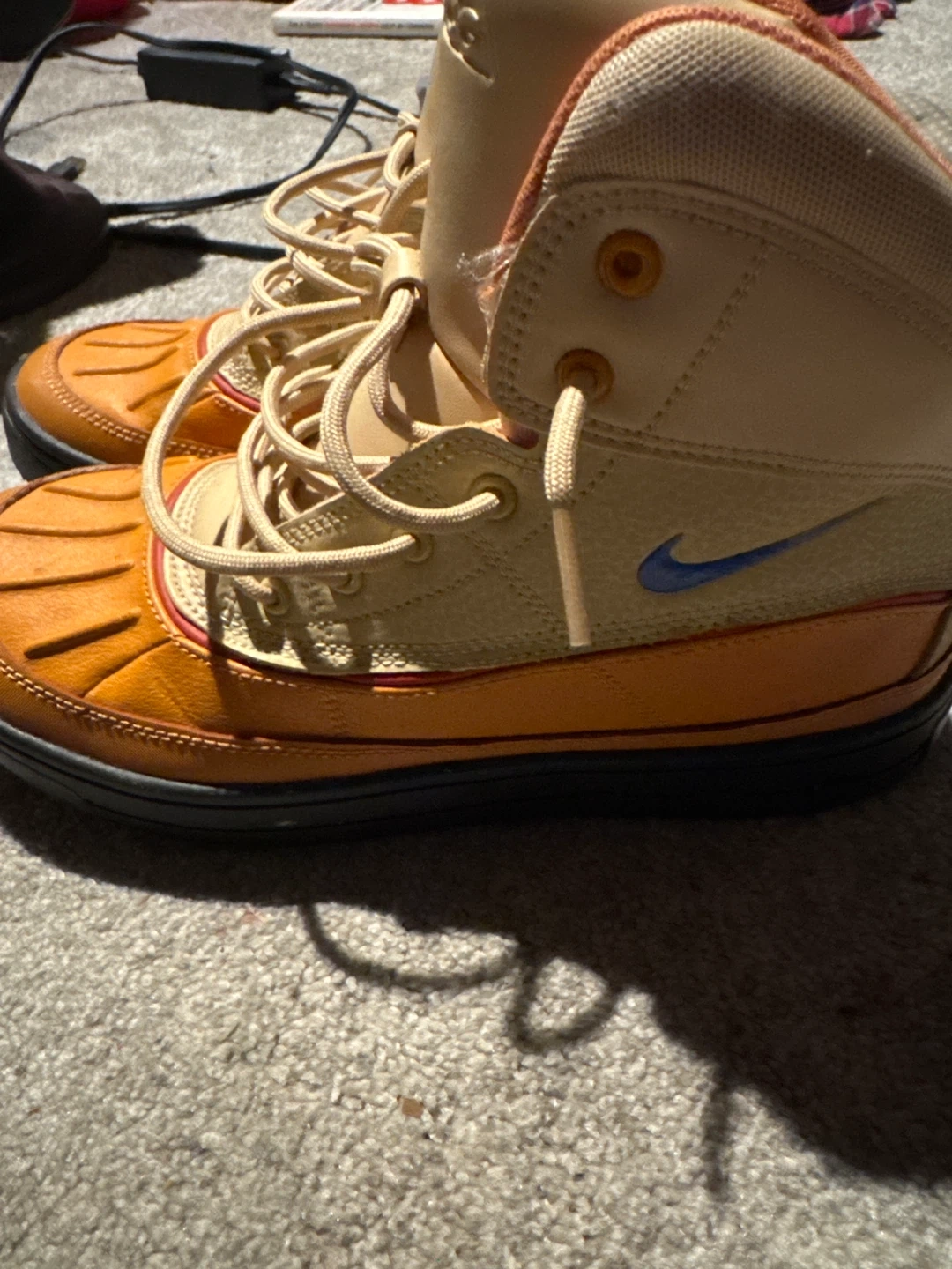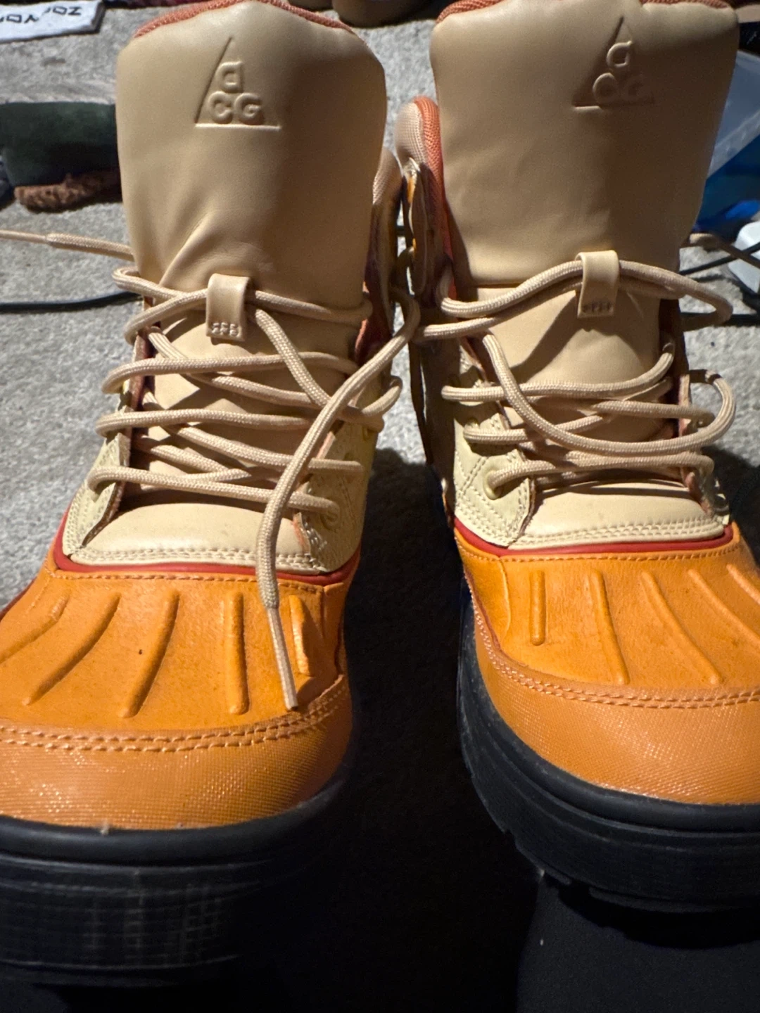 Selling a pair of Nike ACG Air Max Goadome boots in size 6.5Y. These boots are in great condition and ready for some adventures! They feature a durable construction and comfortable Air Max cushioning. The colour is a mix of orange and beige. Perfect for hiking or everyday wear!