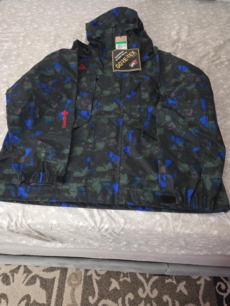 Selling a Nike ACG Gore-Tex jacket. It features a unique camouflage pattern in shades of black, blue, and green. The jacket is designed to keep you dry and comfortable in wet weather conditions with Gore-Tex technology. Perfect for outdoor adventures!