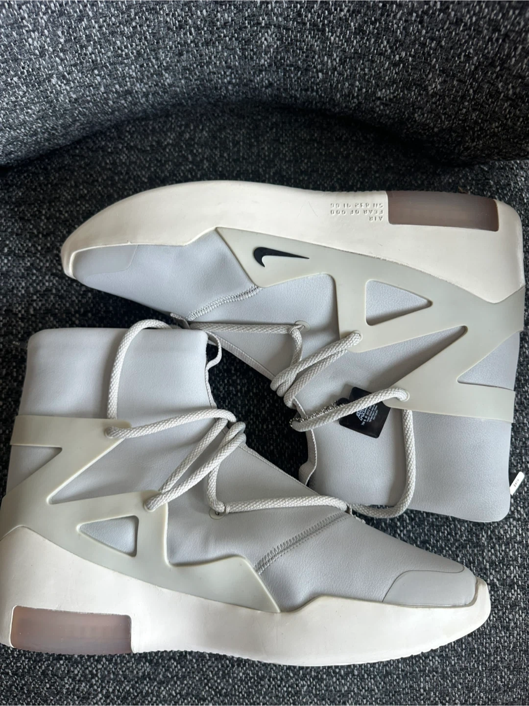 Selling a pair of Nike Air Fear of God 1 in the Light Bone colourway! These are a stylish and comfortable high-top sneaker, perfect for everyday wear. They feature a unique design with premium materials. Don't miss out!