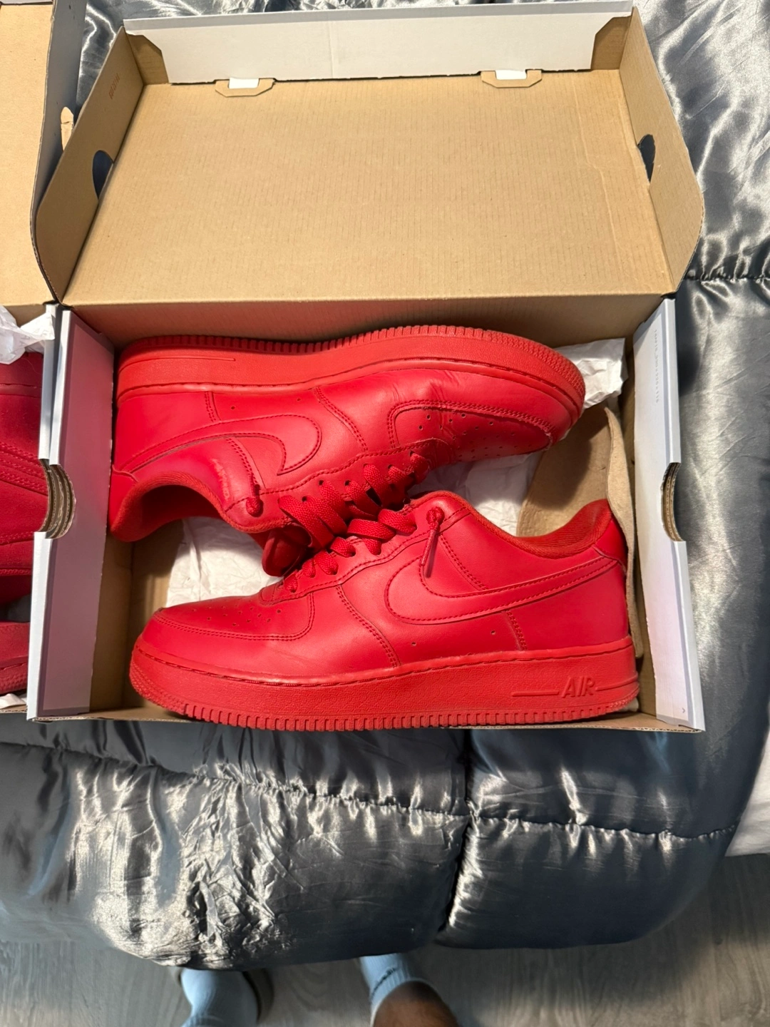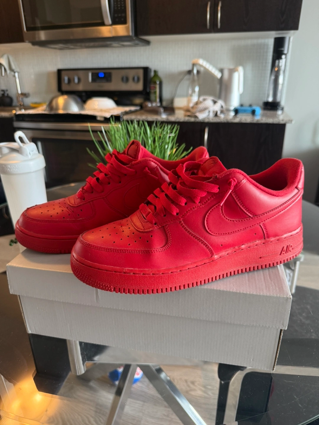 Selling a pair of Nike Air Force 1 '07 in a vibrant red colour. They are in excellent condition and come with the original box. Size is 10 US. These classic sneakers are perfect for adding a pop of colour to any outfit!