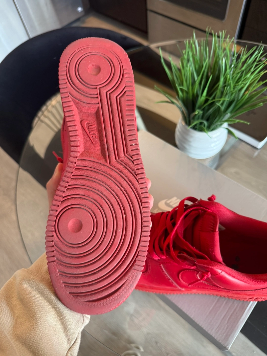 Selling a pair of Nike Air Force 1 '07 in a vibrant red colour. They are in excellent condition and come with the original box. Size is 10 US. These classic sneakers are perfect for adding a pop of colour to any outfit!