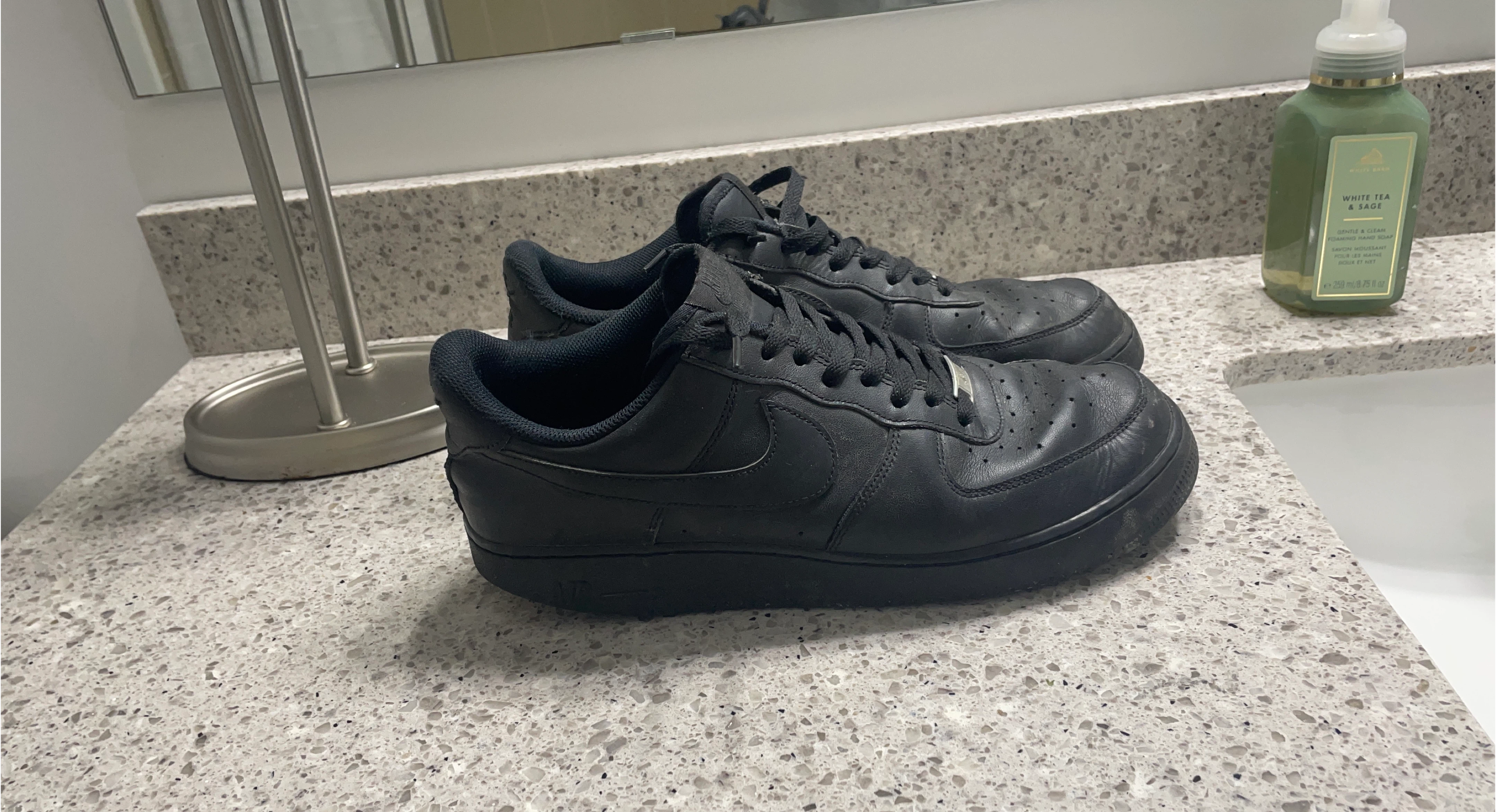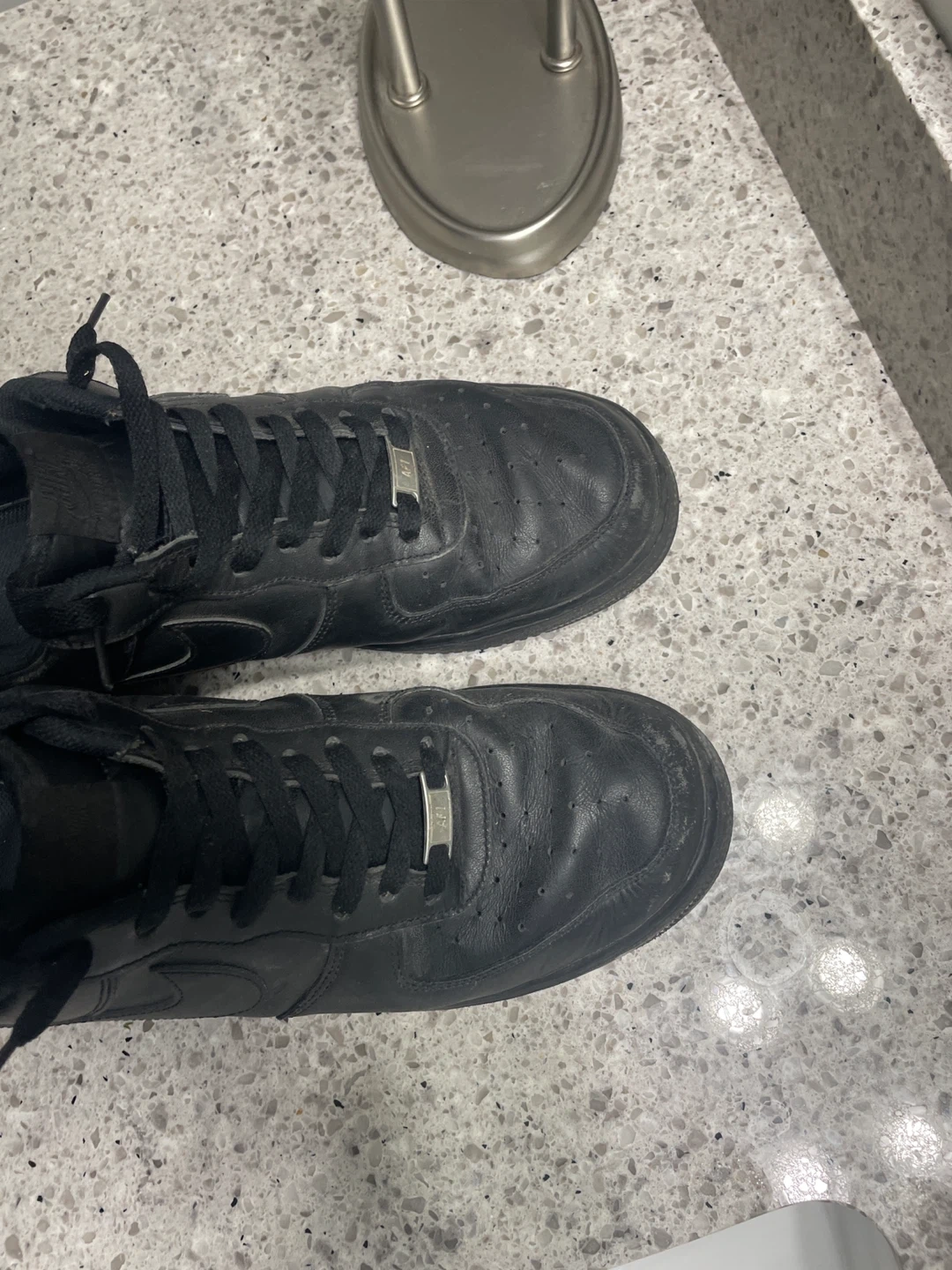 Selling a pair of black Nike Air Force 1s. They show some signs of wear, as you can see in the photos, but still have lots of life left in them! Great for everyday wear.