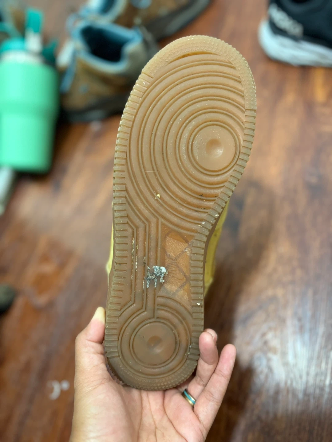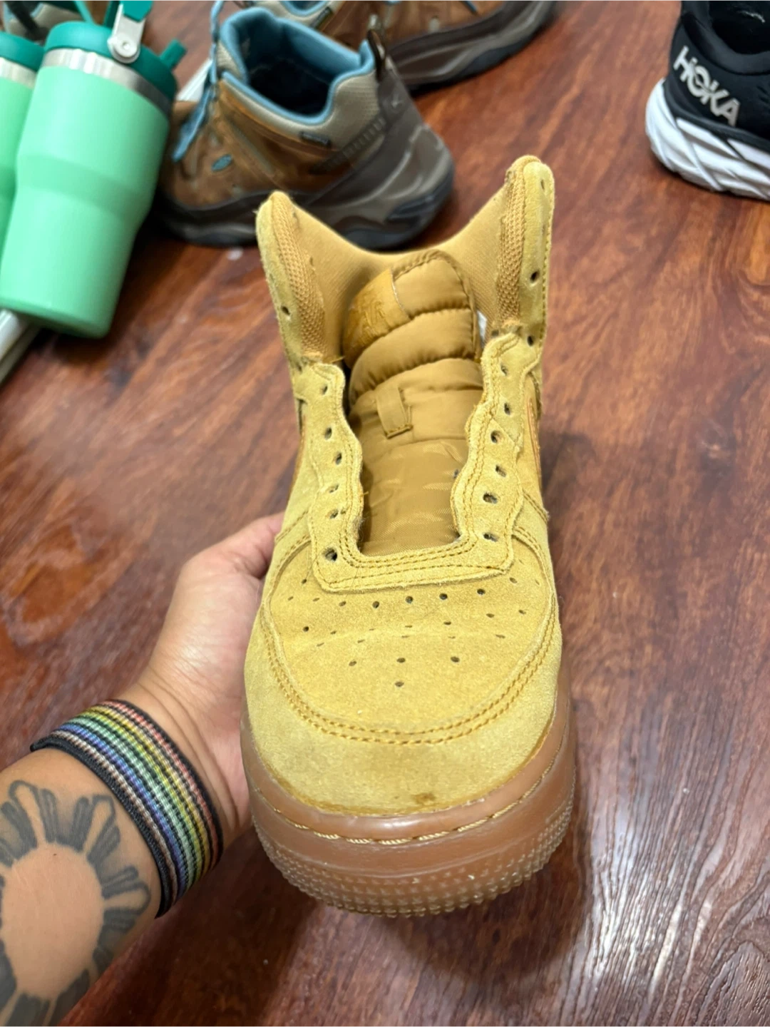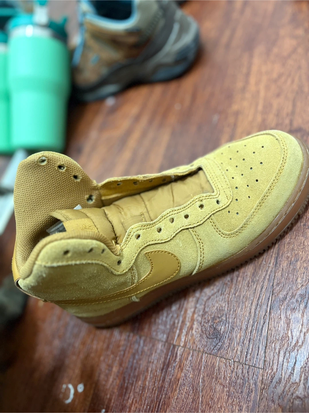 Selling a pair of Nike Air Force 1 High sneakers in a unique mustard yellow colour! These shoes are in used condition but only worn a handful of times . Shoelaces not included Size : 7 Y 65 OBO