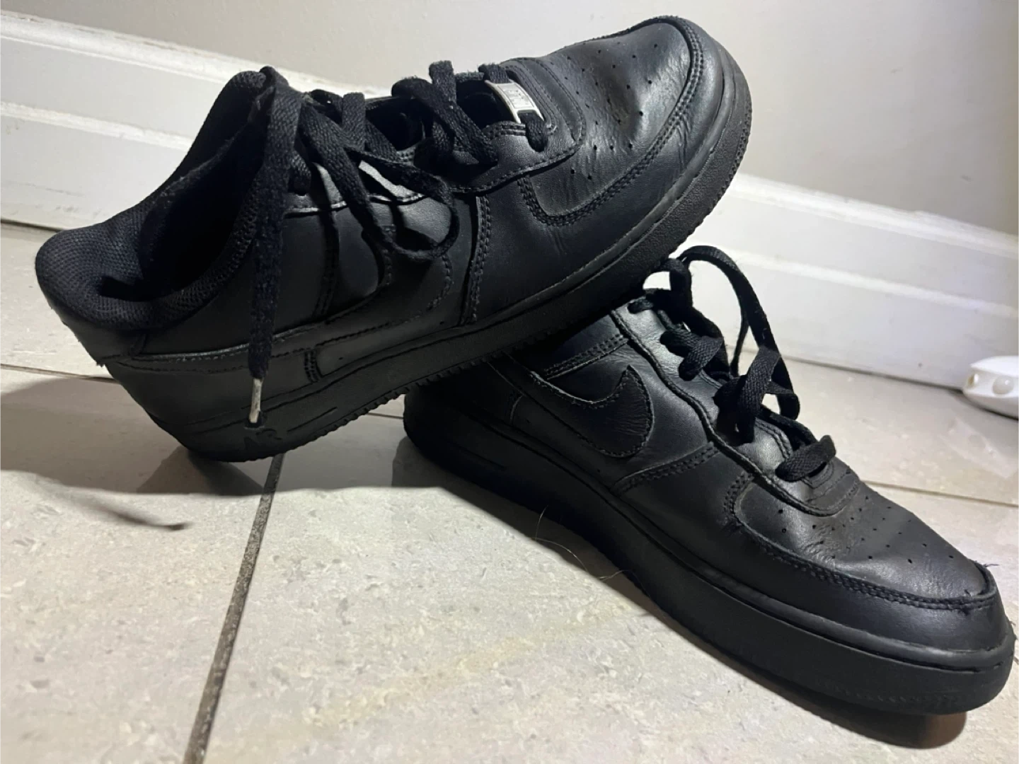 Selling a pair of Nike Air Force 1 Low sneakers in black. These are a classic and versatile shoe that goes with just about anything. They show some signs of wear but still have plenty of life left!