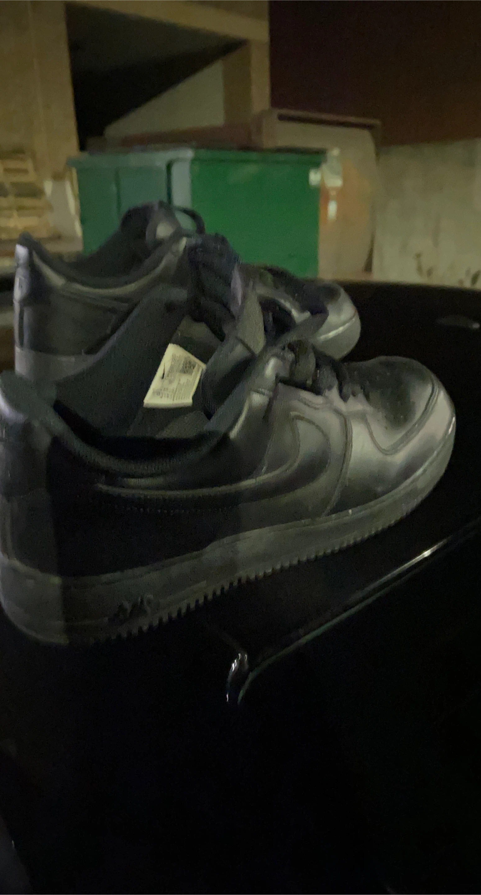 Selling a pair of Nike Air Force 1 Low sneakers in black. They show signs of wear, as seen in the photos. Still lots of life left in them!