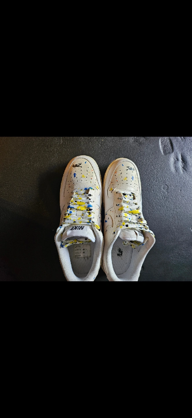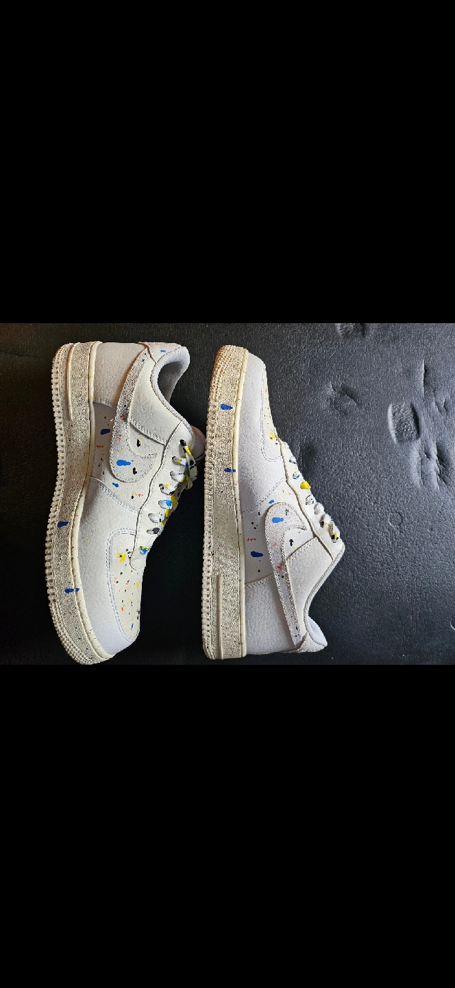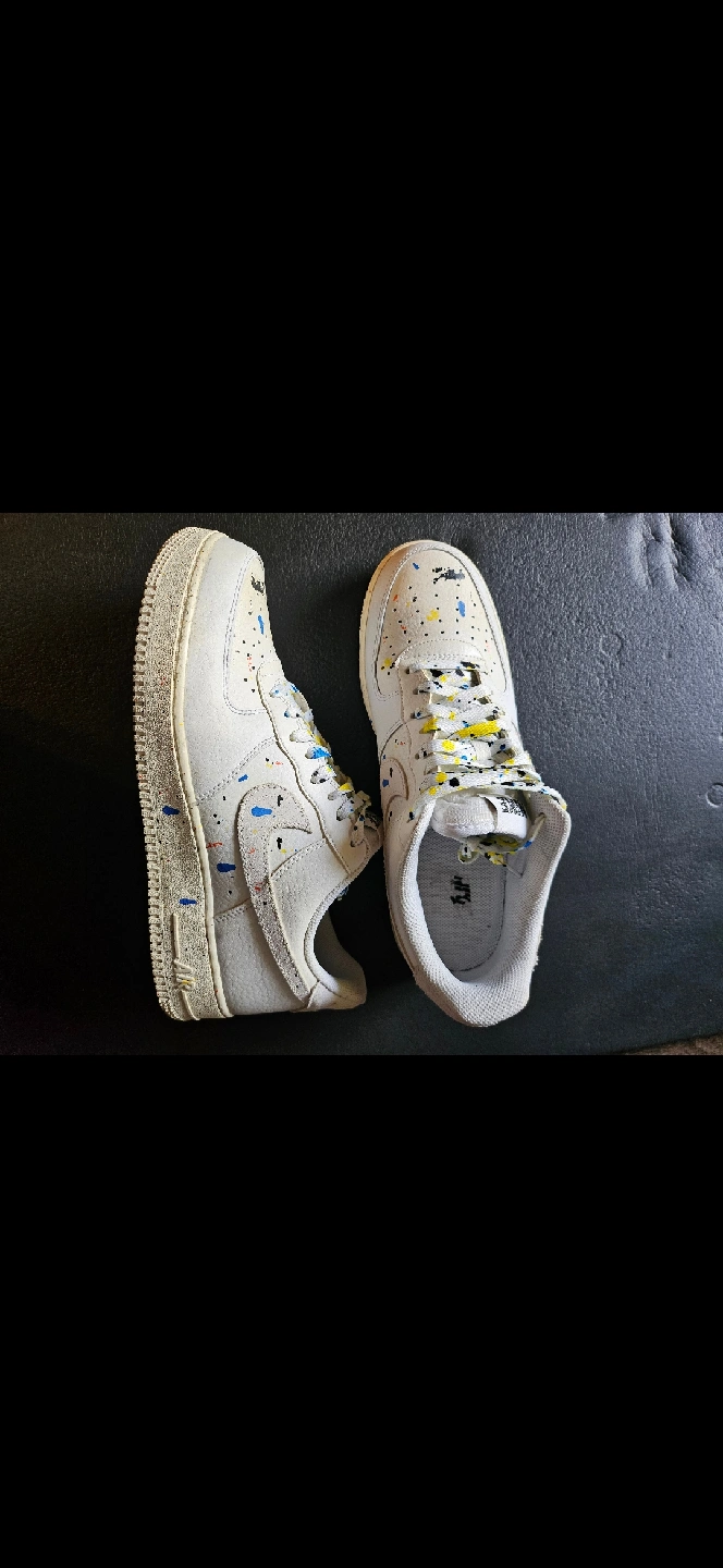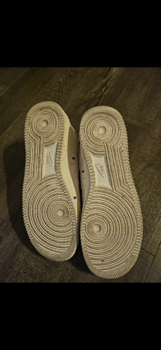 Selling a pair of Nike Air Force 1 Low sneakers. They have a unique design with colourful paint splatters. These shoes are in used condition, as you can see from the soles. Size 11