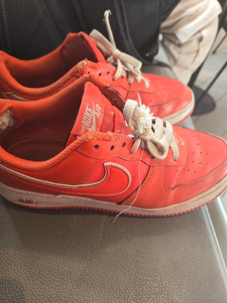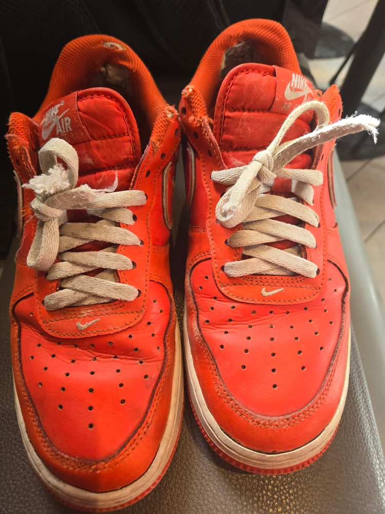 Pre-owned Nike Air Force 1 Low sneakers. Bright red leather upper. Visible wear and tear. Off-white laces. Good for casual wear.