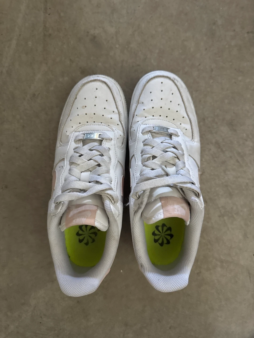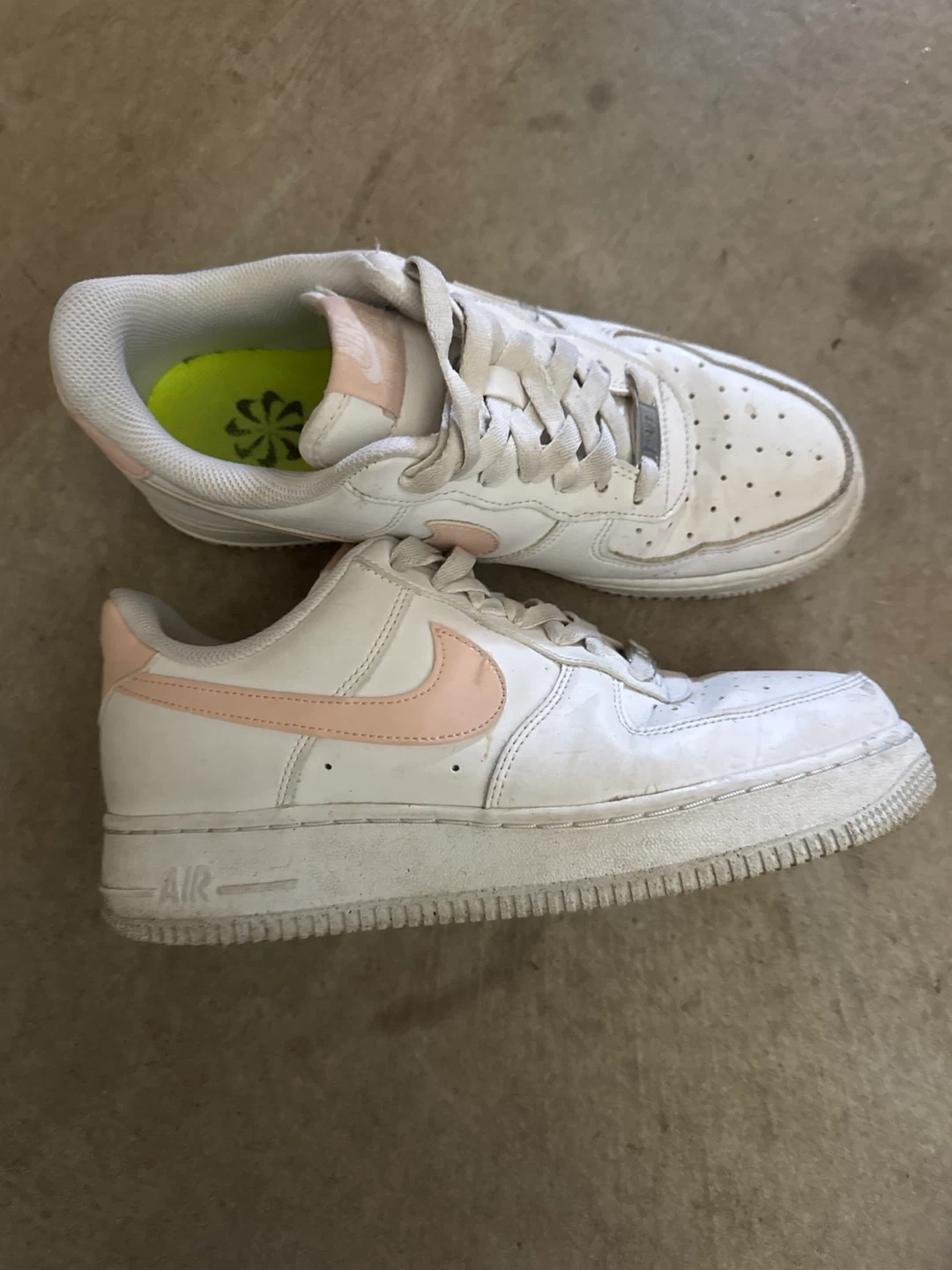 Selling a pair of women's Nike Air Force 1 sneakers. They're white with a pink swoosh. Size is a women's 8.5 US. They've got some wear, but still have lots of life left!