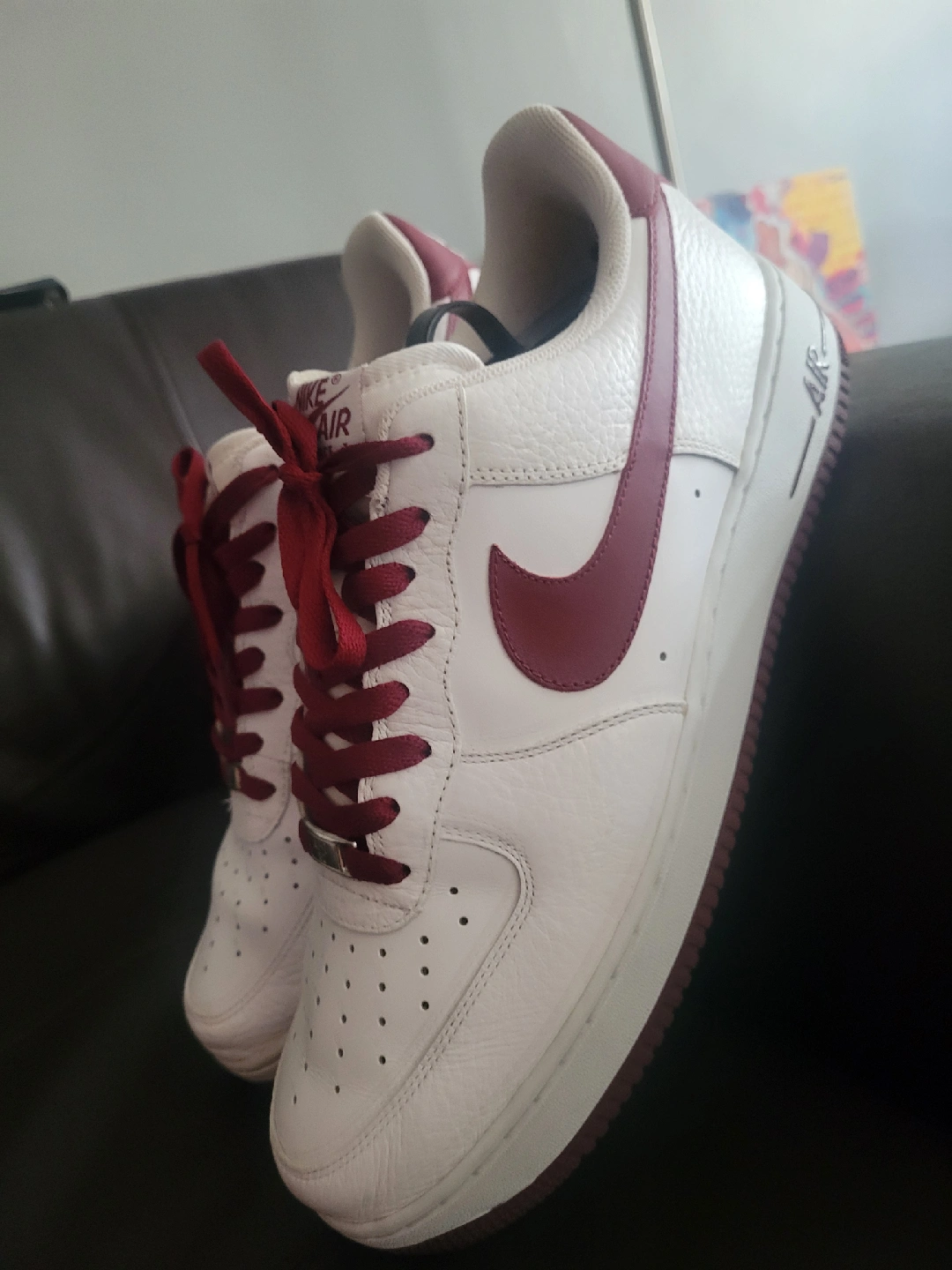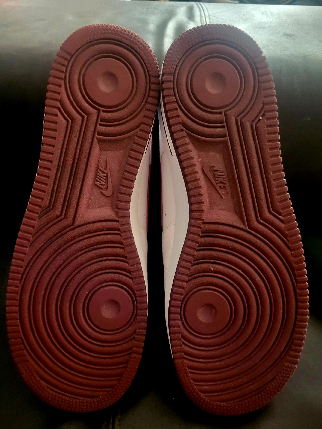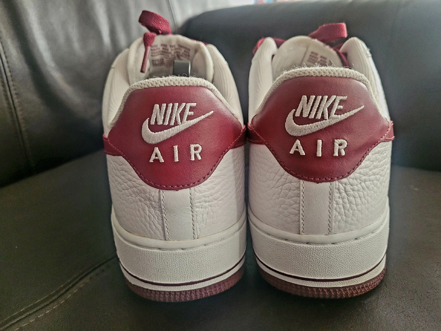 Selling a pair of Nike Air Force 1s in white with burgundy accents. They're in great shape and ready for a new home! The classic design and colourway make them a versatile addition to any wardrobe. Check out the photos for a closer look!