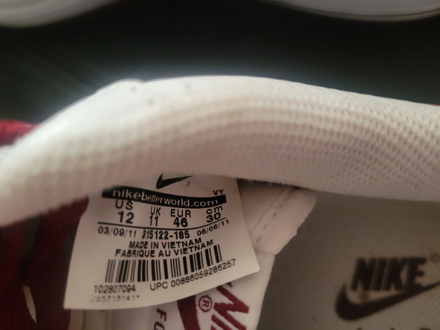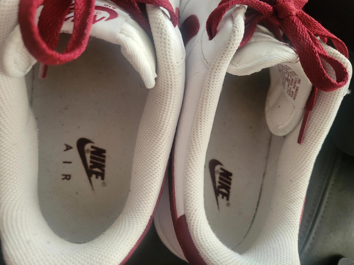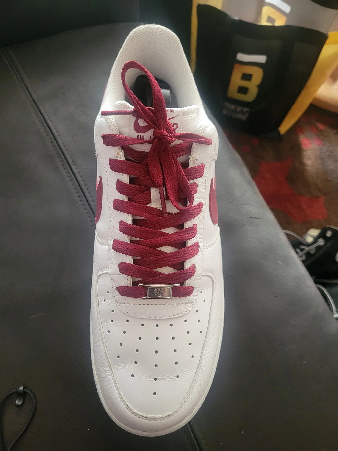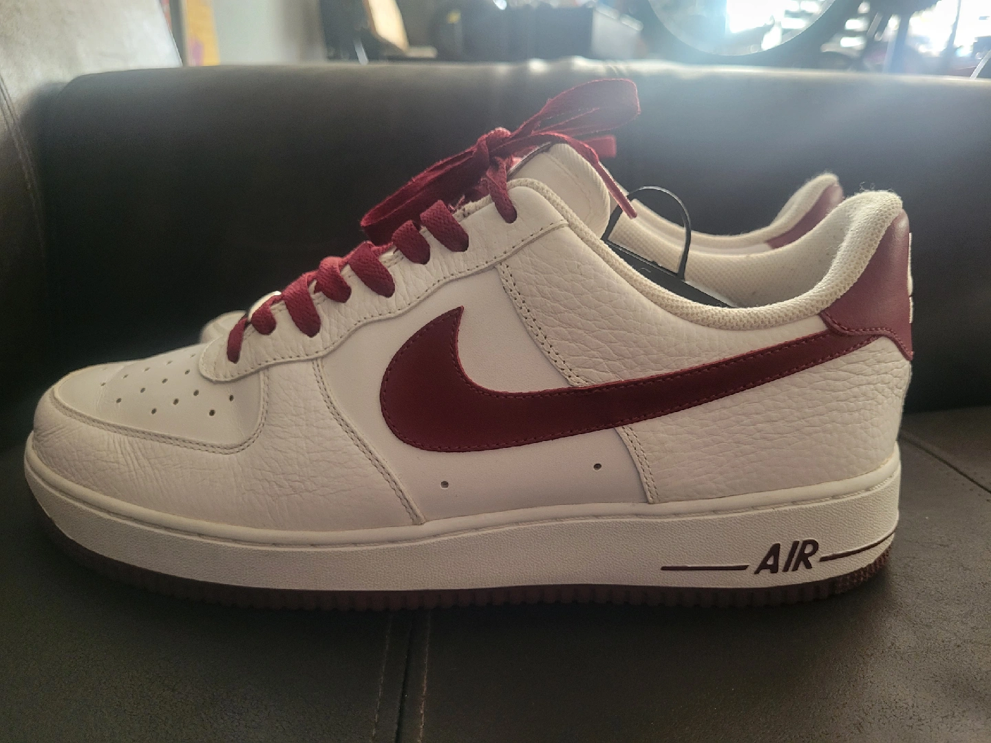 Selling a pair of Nike Air Force 1s in white with burgundy accents. They're in great shape and ready for a new home! The classic design and colourway make them a versatile addition to any wardrobe. Check out the photos for a closer look!